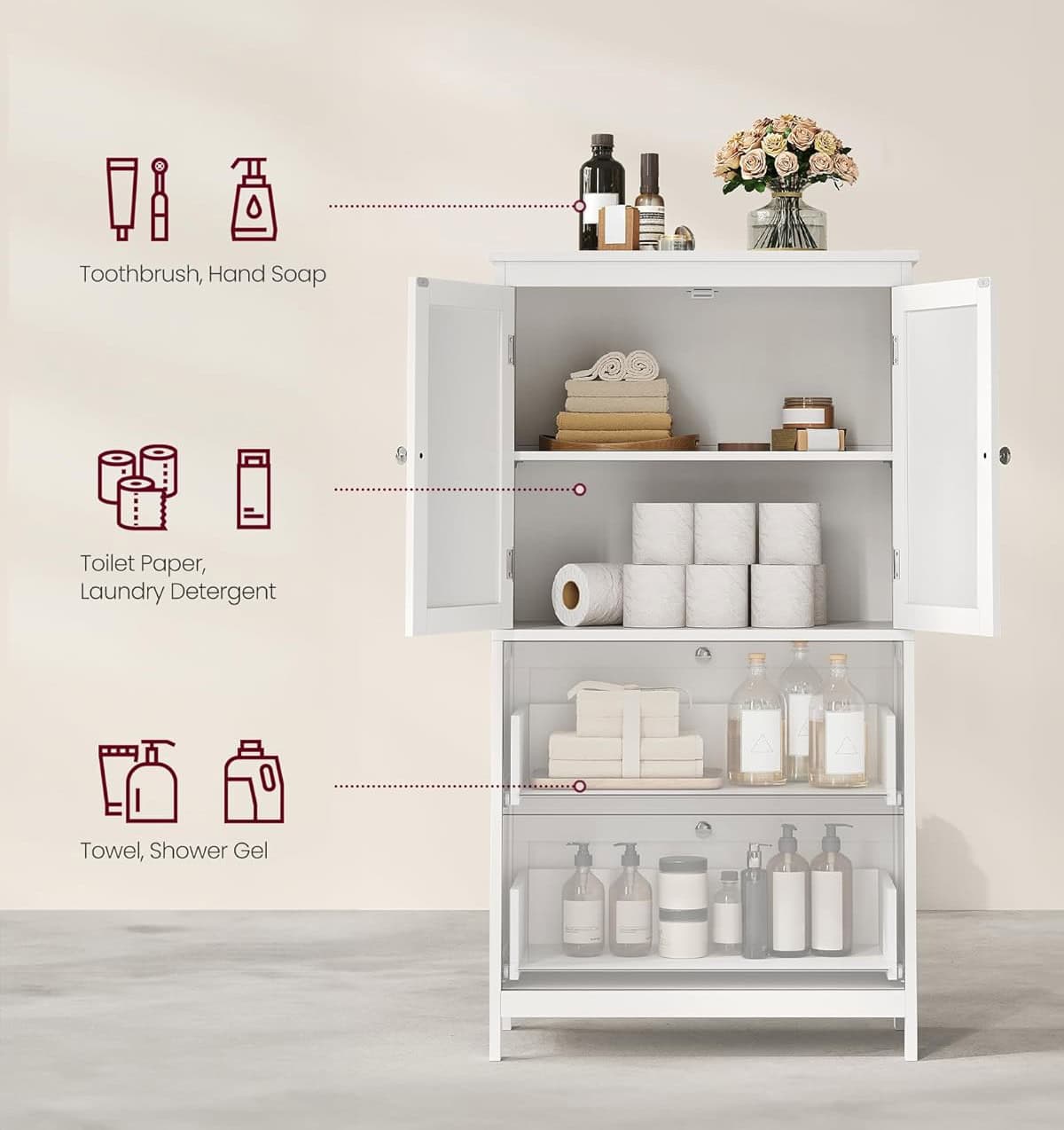 Kitul anti-inclinare furnizat va ajuta sa fixati dulapul de baie de perete, creand un mediu de viata sigur. Asamblarea acestui dulap independent este floare la ureche, cu piese etichetate si instructiuni simple.