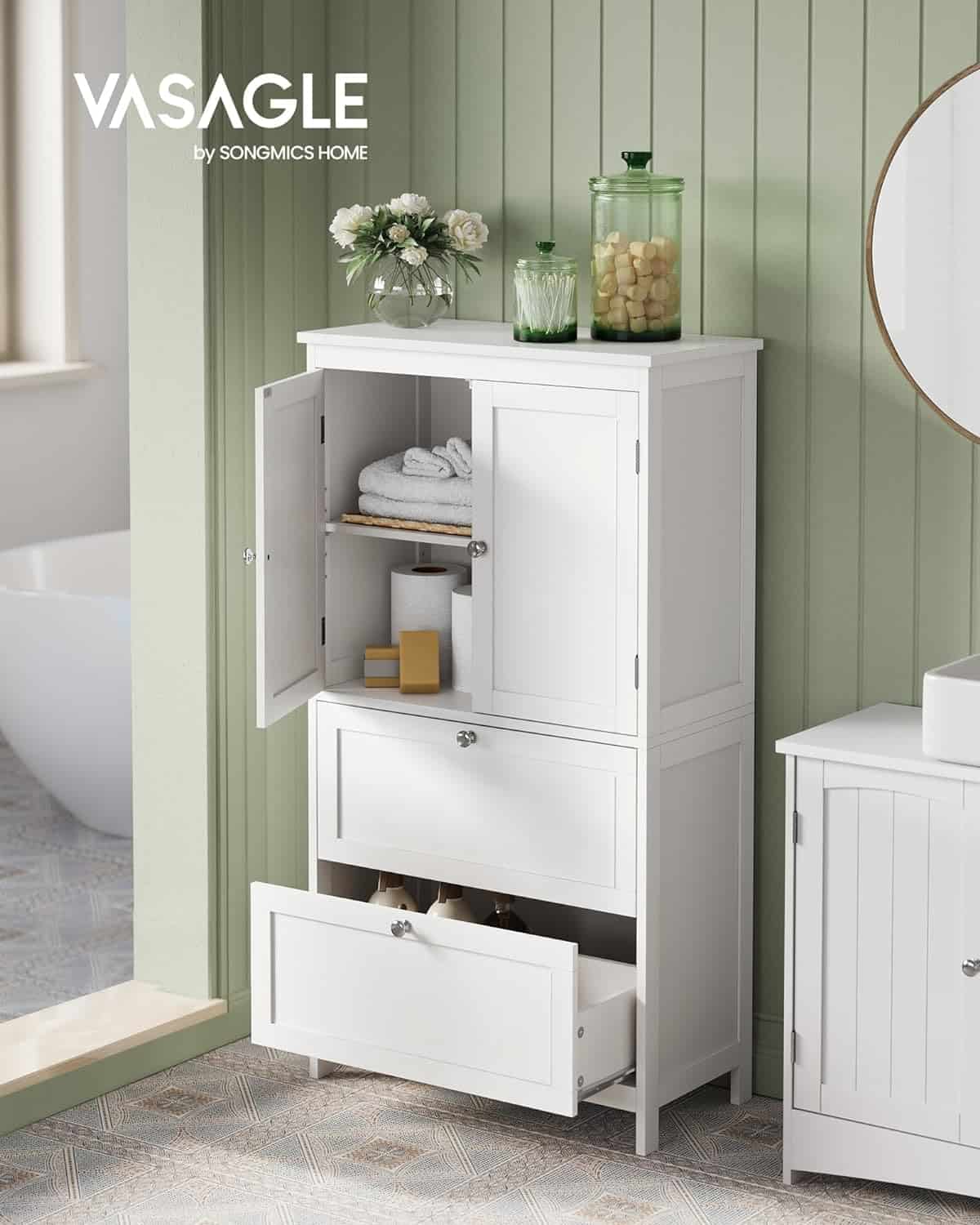 VASAGLE Dulap de baie, din MDF, cu 2 sertare si 2 usi, raft reglabil, 30x60x110cm, alb Mob360 este disponibil în magazinul Mob360.