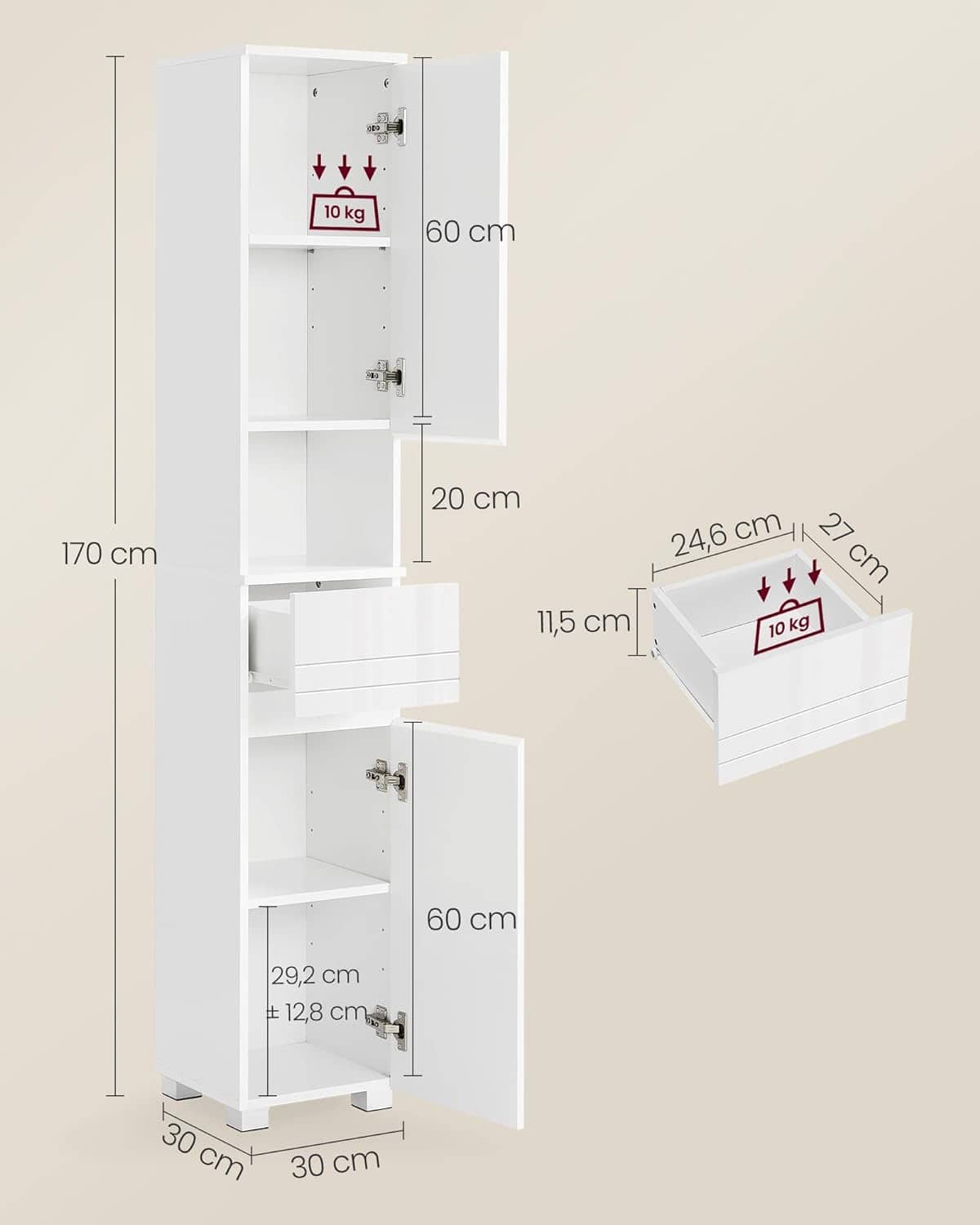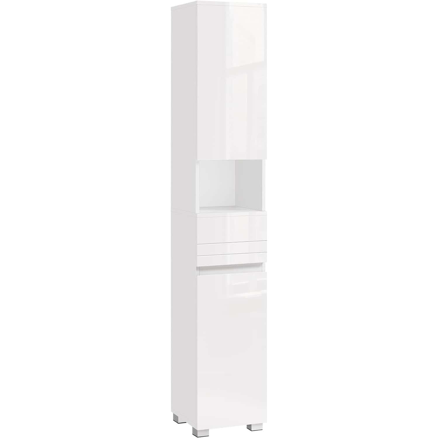 VASAGLE Dulap de baie tip coloana, din MDF, cu sertar si 2 usi, 30x30x170cm, alb Mob360