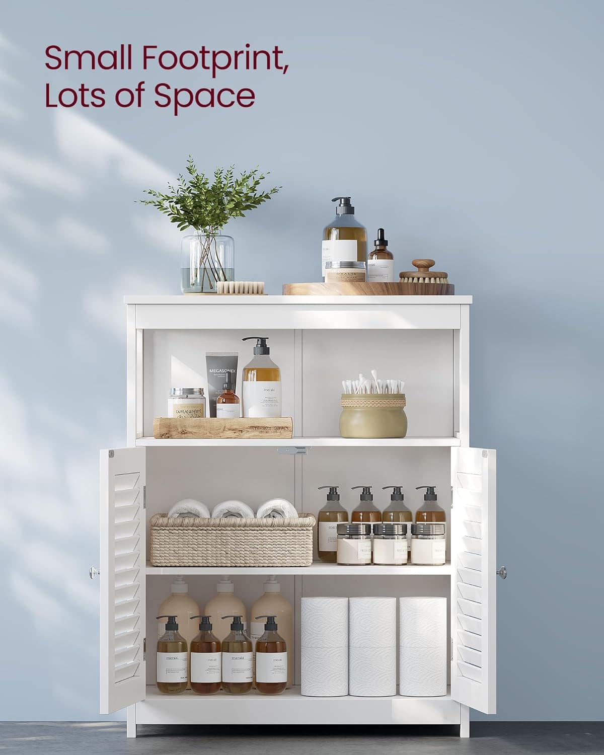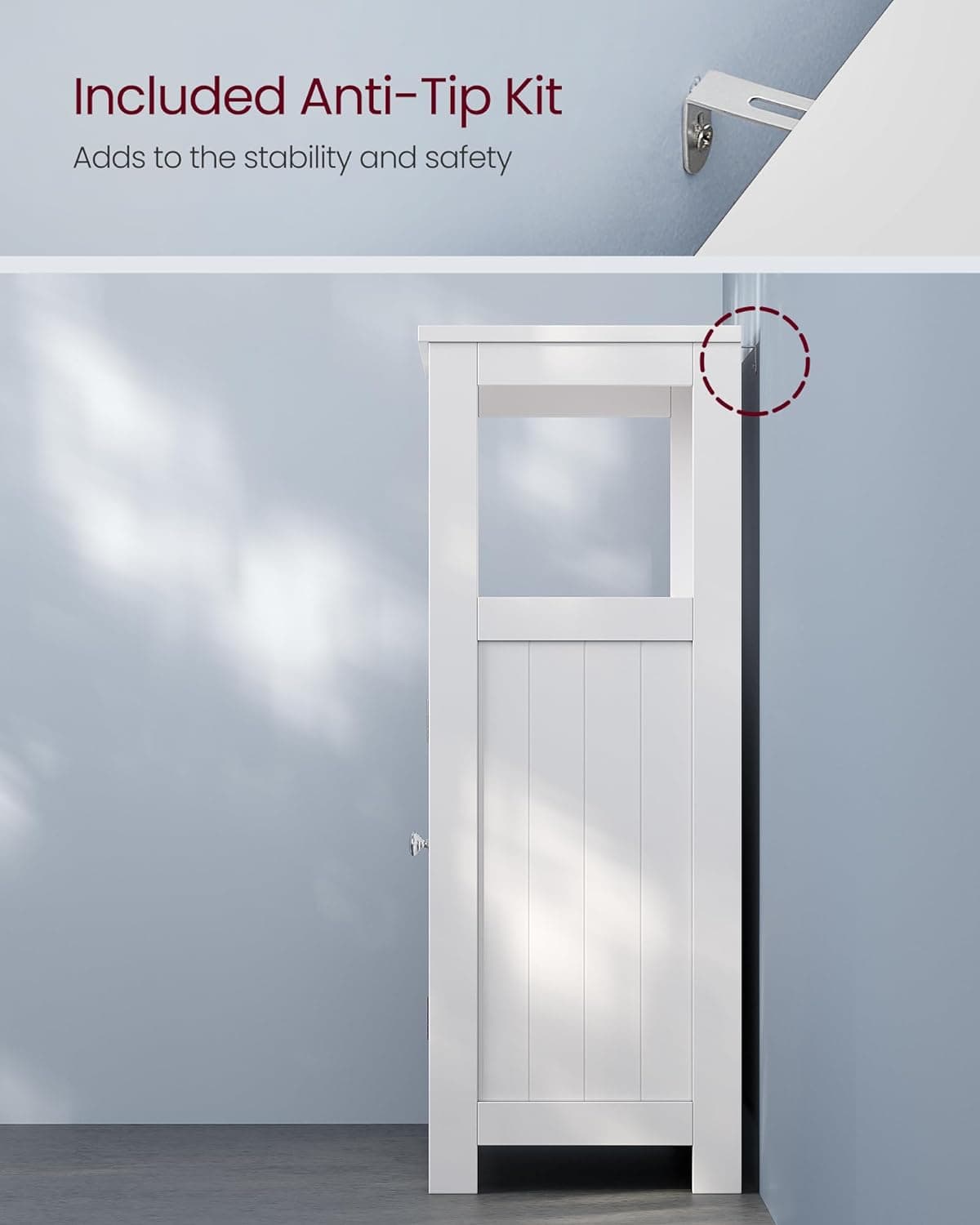 Marca VASAGLE Culoare: alb Dimensiunile produsului: 30D x 60L x 80H cm Caracteristica speciala: durabil Toate elementele acestui dulap se imbina perfect: finisajul alb mat, usile elegante cu lamele si simplitatea generala a profilului; aduce usurinta si o nota de liniste in timpul baii si in rutina de trezire.Pe langa aspectul sau placut, acest dulap de depozitare convinge si prin structura sa. O suprafata usor de curatat, panourile durabile din lemn prelucrat si detaliile rafinate lucreaza impreuna pentru o utilizare de lunga durataFericirea este gata! Deschideti usile sale cu oblon… prosoapele dvs. curate sau hartia igienica suplimentara se afla pe raftul cu 3 optiuni de inaltime. Deasupra ei? Articolele dvs. des folosite se afla in compartimentul deschis. Parfumurile sau produsele esentiale de infrumusetare isi gasesc o scena pe suprafata superioara! Numele acestui dulap de baie este doar o sugestie – foloseste-l in camera de zi ca unitate de depozitare, in holul de la intrare ca raft de intrare sau chiar intr-un colt care altfel ar fi inutil (extrem de versatil).Timpul liber este asigurat: Bucuria de a primi mobilier nou este intotdeauna distrusa de pasii complicati de asamblare? Nu si acest dulap de podea! Datorita unei structuri simple si a instructiunilor pas cu pas, il veti pregati in cel mai scurt timp