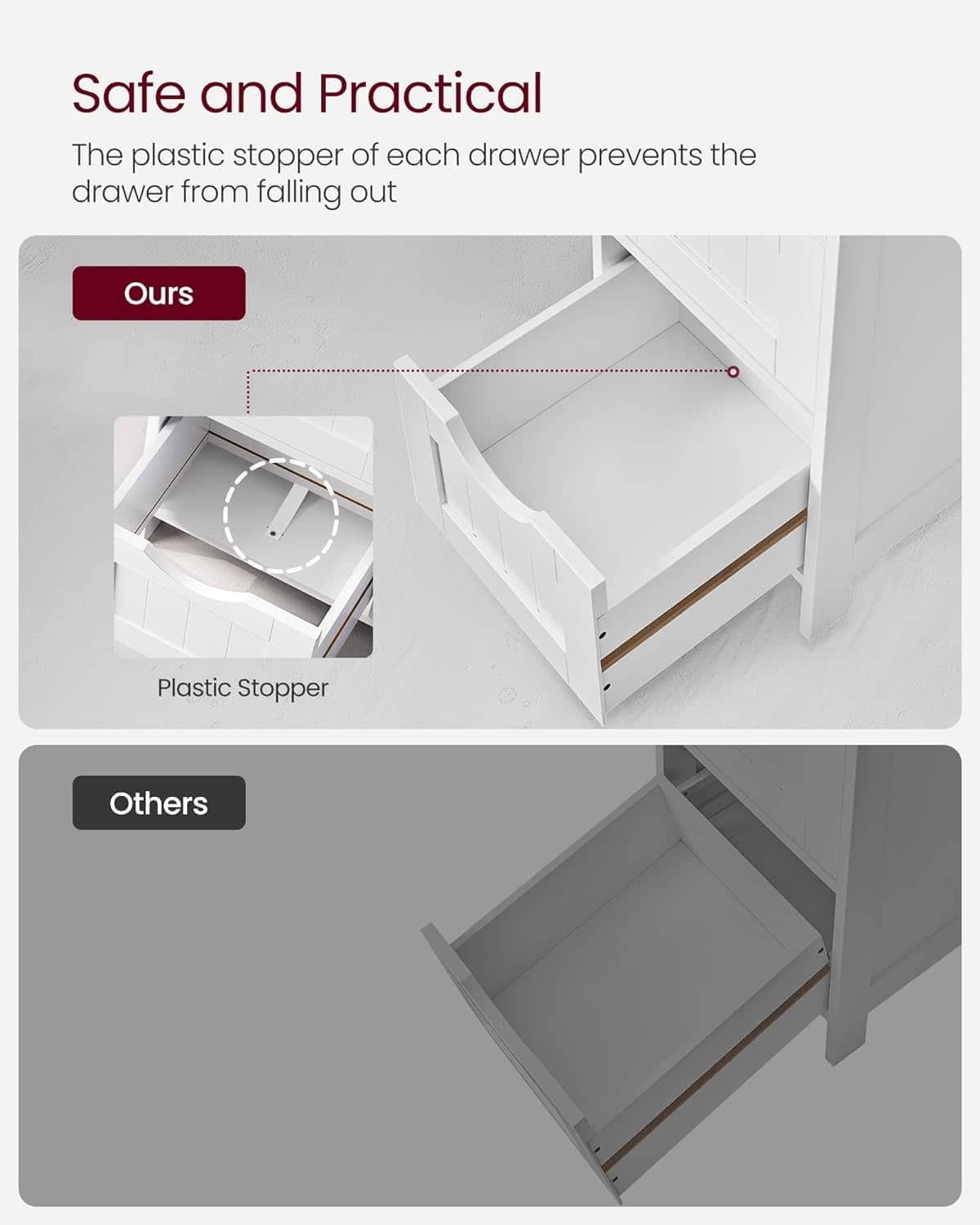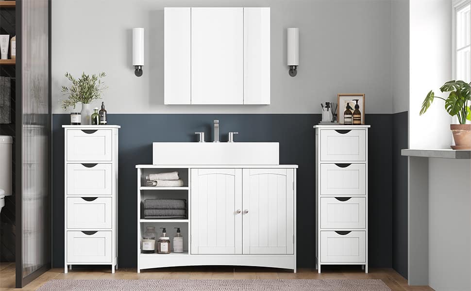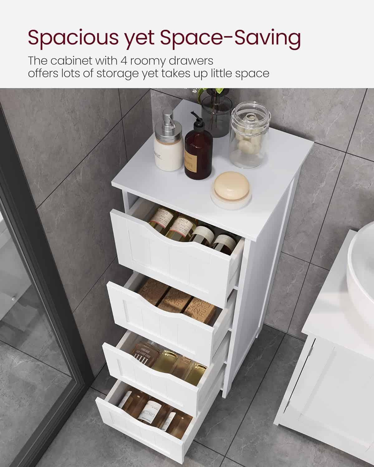 Incapator, dar care economiseste spatiu: Acest dulap de baie de 30 x 30 x 82 cm cu 4 sertare ocupa putin spatiu pe podea, dar ofera mult spatiu de depozitare pentru articolele tale de baie, cum ar fi hartie igienica si parfum.