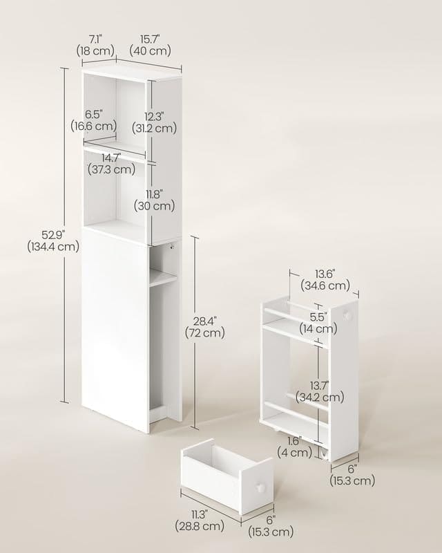 Specificatii: Culoare: alb Material: Placi aglomerate Dimensiunea produsului: 40 x 18 x 134.4 cm Greutatea produsului: 15,5 kg Despre acest articol Perfect pentru colturi stramte: Cu dimensiuni de 40 x 18 x 134.4 cm, acest dulap de baie ingust, dar inalt, este conceput pentru a maximiza spatiul.Doua optiuni de configurare: Partea superioara a acestui dulap de baie poate fi configurata pentru a fi orientata fie spre stanga, fie spre dreapta, asigurandu-se ca se potriveste cu orice amenajare a spatiului si garantand o comoditate optima, indiferent de directia in care este orientata toaleta dvs.Stabil si durabil: Realizat din placi aglomerate de inalta calitate, acest dulap de depozitare pentru baie este stabil si solid pentru a rezista la testul timpului. In plus, este prevazut cu un kit anti-inclinare pentru o stabilitate sporita, asigurand ca nu se va clatina pe podele inegale.Usor de asamblat: Acest dulap de baie este usor de asamblat, datorita instructiunilor clare si a pieselor etichetate.