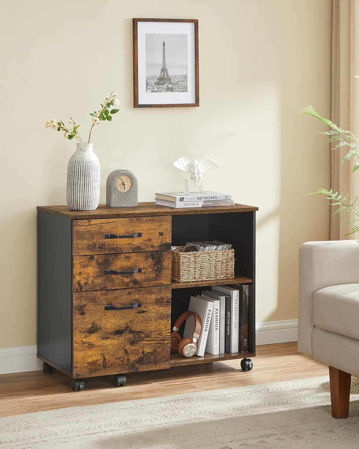 VASAGLE Dulap mobil tip rollbox pentru birouri, sertar cu sina suport dosare, stil industrial, 40x80x66 cm, maro rustic Mob360