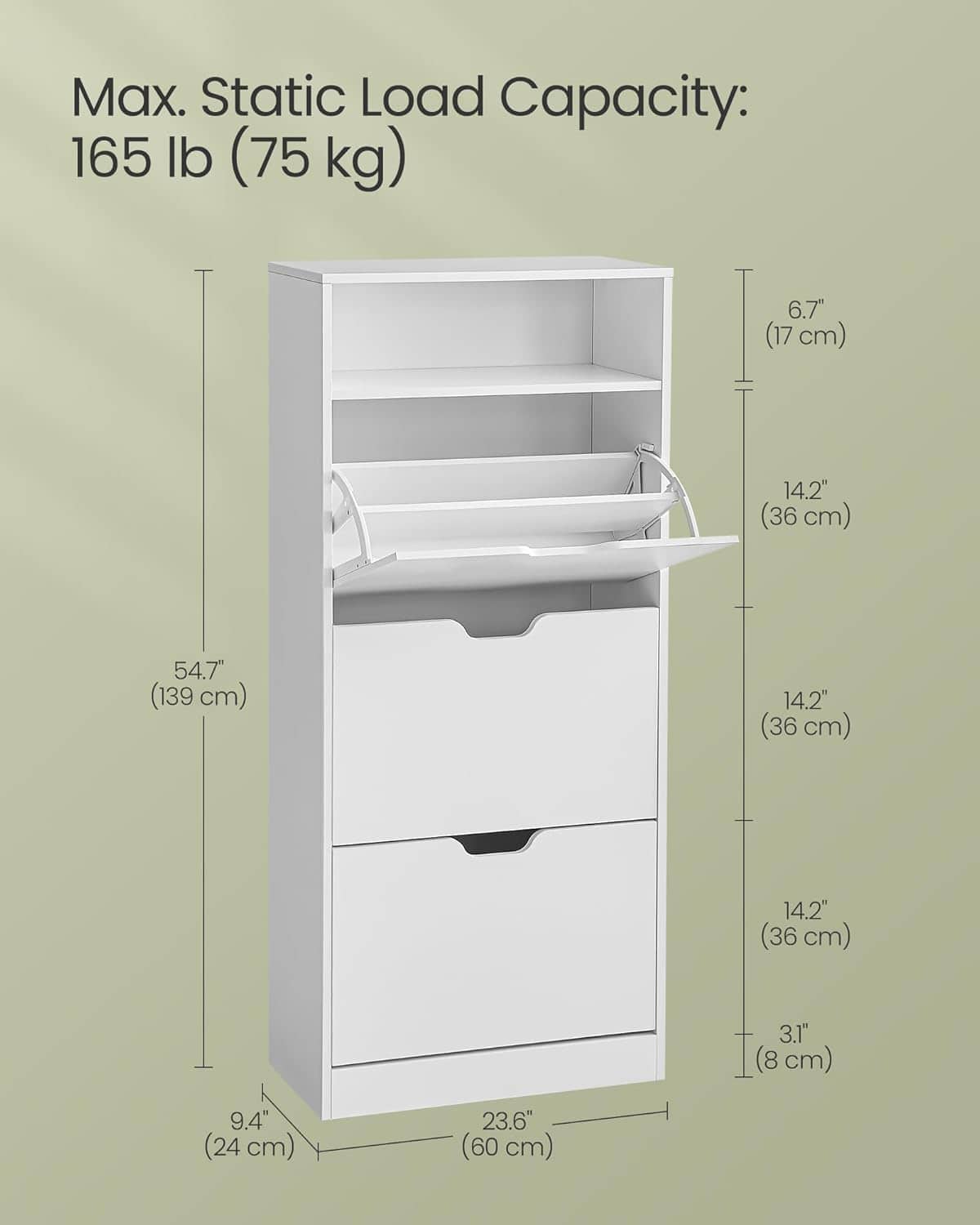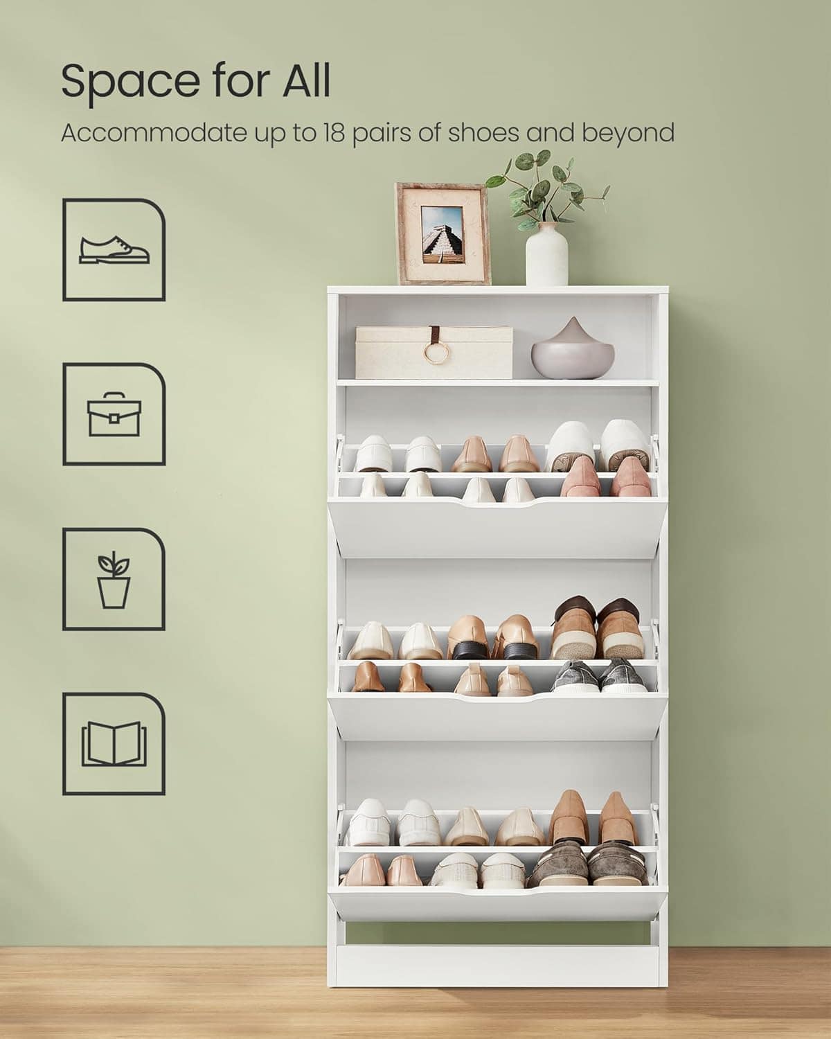VASAGLE Dulap pantofi cu 3 usi rabatabile, pentru 14-18 perechi, 60x24x130 cm, alb Mob360