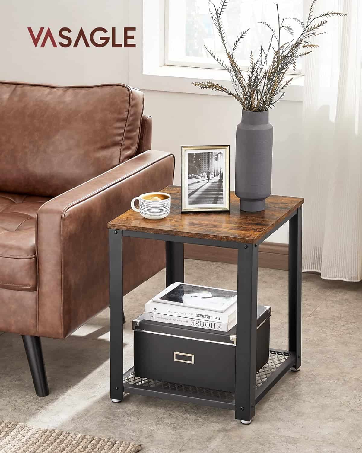 VASAGLE Masa de cafea laterala, tip noptiera, cu cadru metalic, 45x45x55cm, maro rustic si negru Mob360