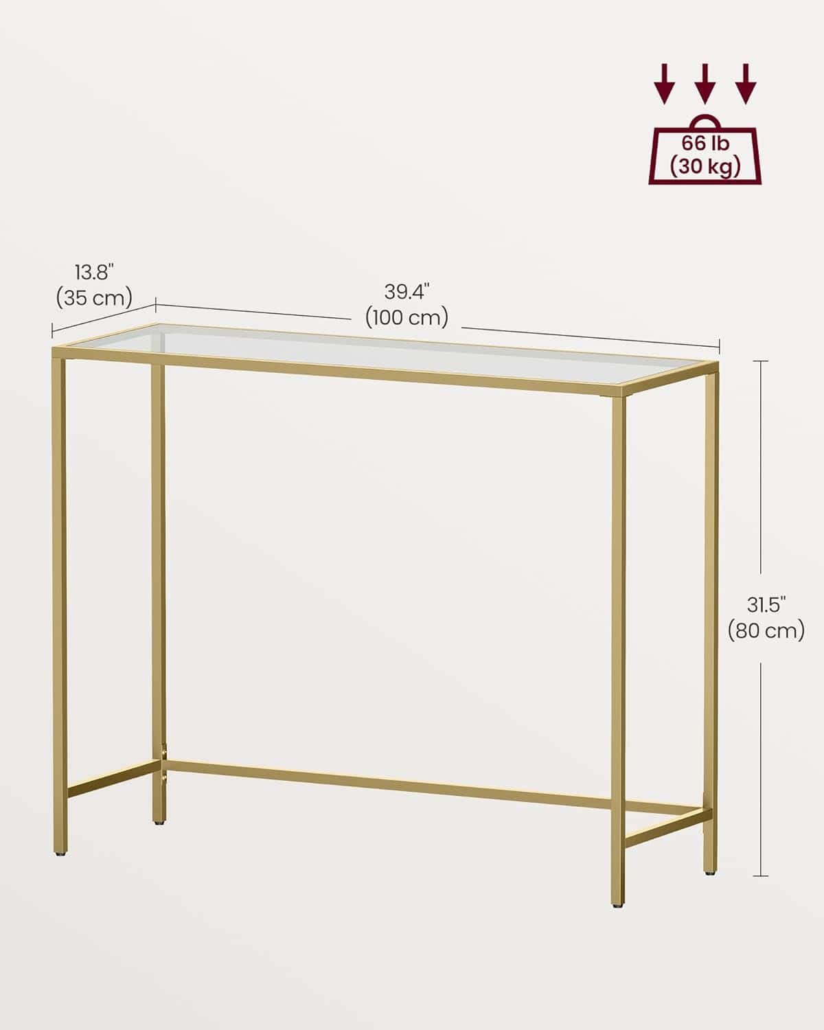 VASAGLE Masa de intrare, blat din sticla securizata, cadru metalic, 35x100x80cm, auriu Mob360