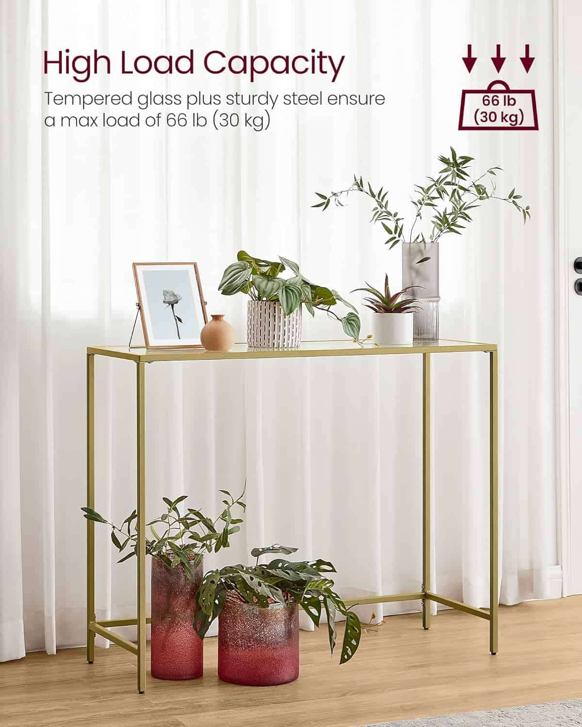 Minimalism uluitor: Du-ti casa la urmatorul nivel cu o masa consola moderna care uneste otel elegant, de culoare aurie si un blat din sticla calita intr-o singura piesa minimalista, dar functionala.Suport puternic: Sticla securizata cu grosimea de 5 mm se afla amplasata deasupra cadrului de otel al acestei mese consola de 35 x 100 x 80 cm (L x l x H), oferind suport robust pentru pana la 30 kg de plante, decoratiuni, carti sau pretuite.