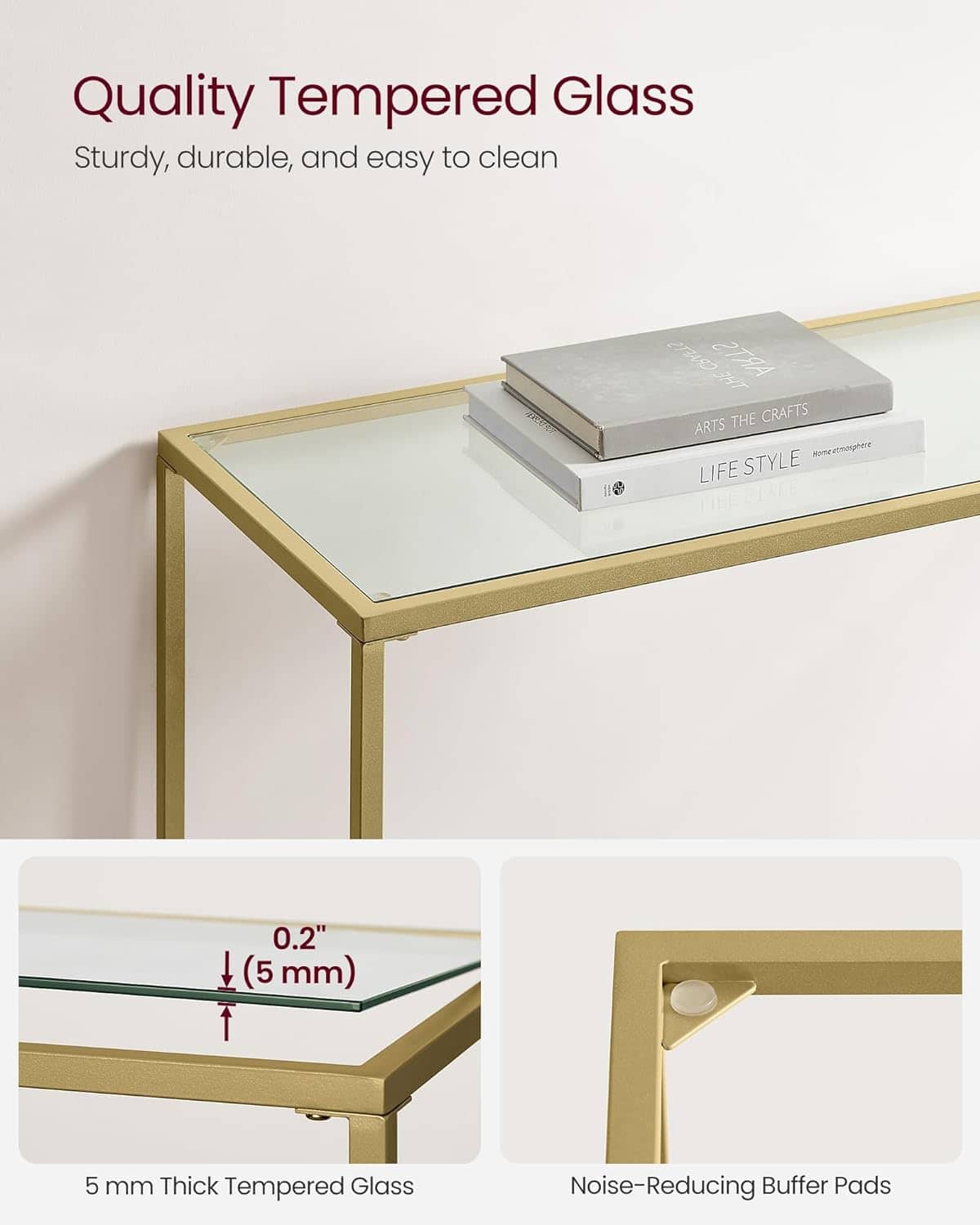 VASAGLE Masa de intrare, blat din sticla securizata, cadru metalic, 35x100x80cm, auriu Mob360 este disponibil în magazinul Mob360.