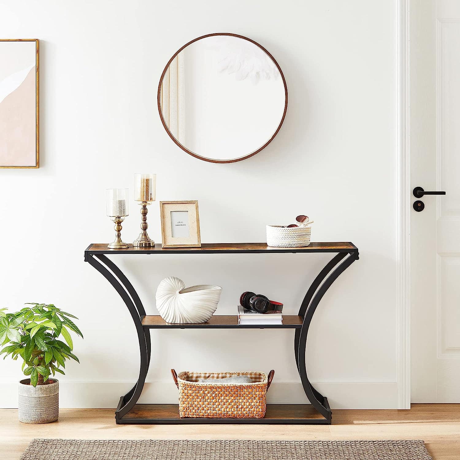 VASAGLE Masa de intrare cu picioare curbate, cadru otel si 3 polite lemn, stil industrial, 120x30x80cm, maro rustic si negru Mob360