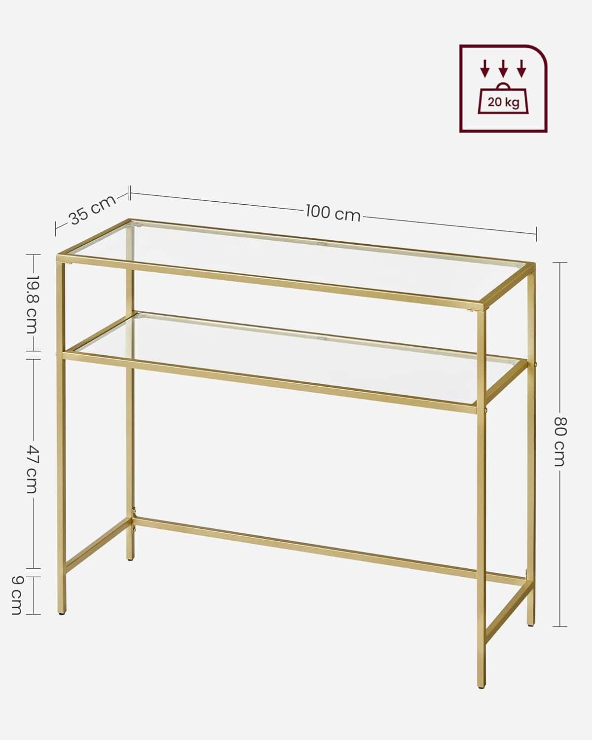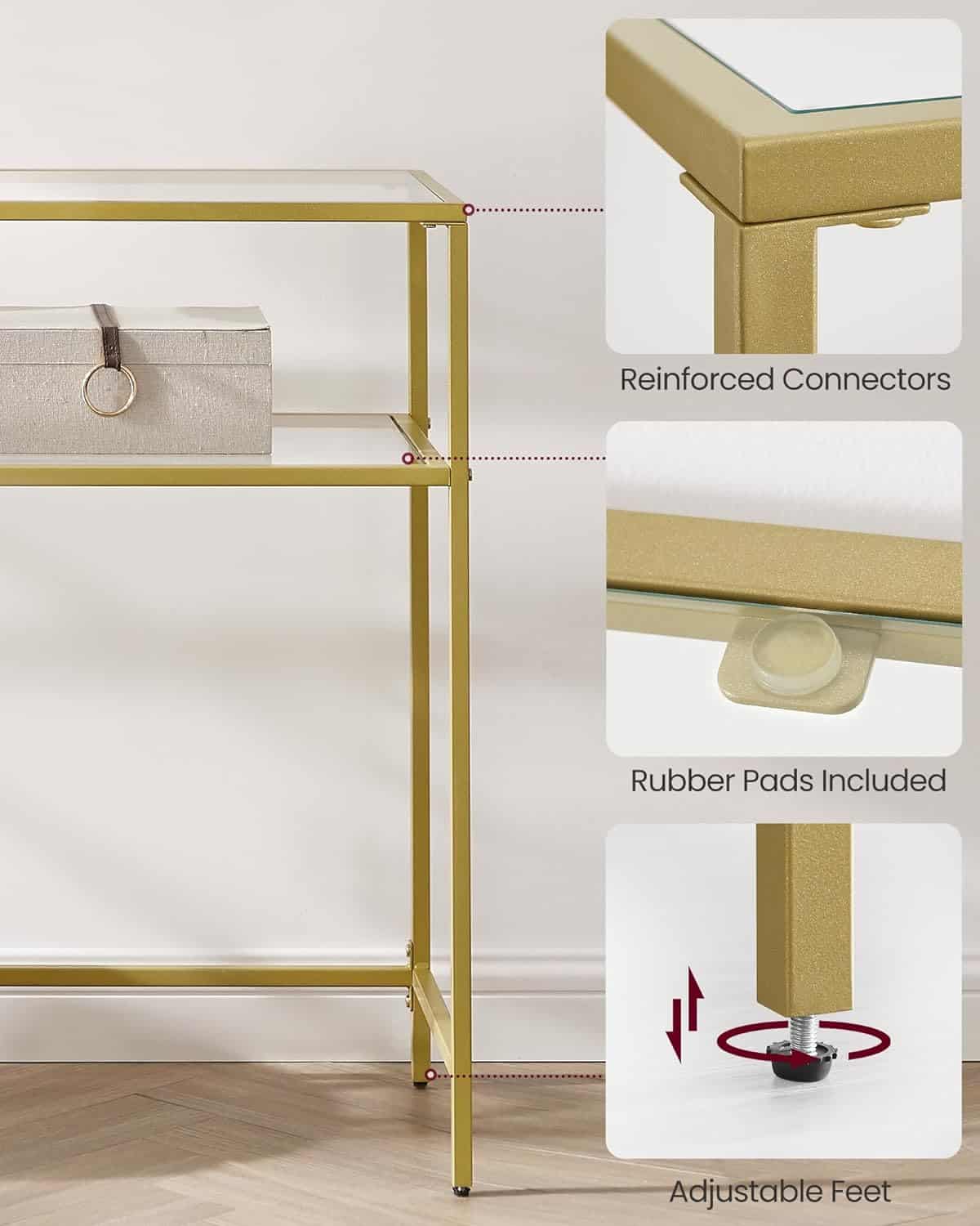 VASAGLE Masa de intrare, pe 2 nivele, blat din sticla securizata, cadru metalic, 35x100x80cm, auriu Mob360 – produs disponibil în magazinul Mob360.