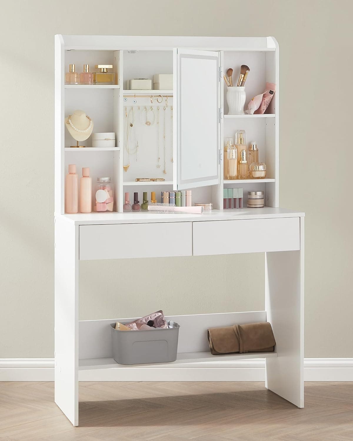 VASAGLE Masa de toaleta cu oglinda, iluminare LED reglabila, 2 sertare, 90x40x145cm, alb Mob360