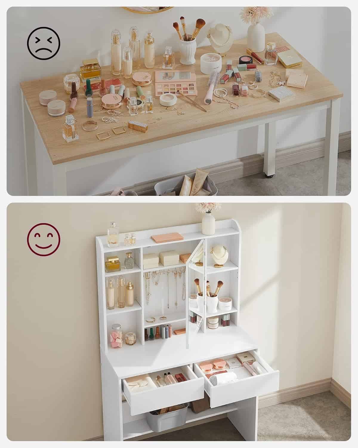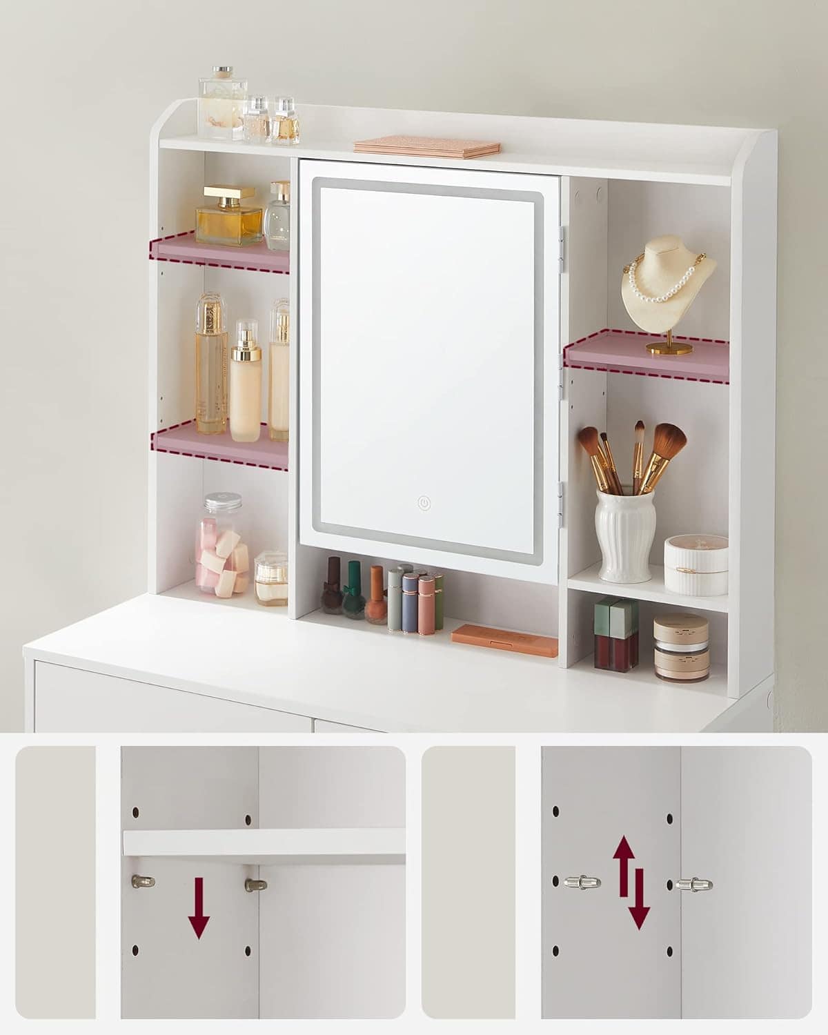Necesita asamblare DaAdancimea articolului 40.0 cmProducator VASAGLEDimensiunile produsului 40 x 90 x 144,7 cm;Greutatea produsului 31.6 KilogrameIluminare LED – cu intensitate reglabila 3 culori de lumina – cald, rece, neutruMaterial PAL Mare si incapatoare: 1 raft in partea de sus pentru parfumurile dvs., 7 compartimente deschise pentru cosmeticele dvs., 2 compartimente si carlige in spatele oglinzii, 1 blat de masa, 2 sertare si 1 raft in partea de jos, aceasta masuta de toaleta va ofera un spatiu considerabil Iluminare led reglabila: Apasati butonul tactil pentru a schimba culorile luminii, apasati butonul pentru cateva secunde pentru a regla luminozitatea, totul este pus impreuna pentru a va machia rapid Raft reglabil pentru diferite produse: cele 2 placi din stanga si placa din mijloc din dreapta sunt reglabile la 3 inaltimi, pentru a va gazdui produsele de diferite dimensiuni, cum ar fi creme de fata, seruri, fundatii, demachiante si multe altele Stabil si durabil Realizata din PAL de calitate, aceasta masa de machiaj este stabila si durabila in timp. Suprafata sa este rezistenta la uzura si usor de curatat, va va insoti pentru multi ani de acum inainte Stil simplu si modern Designul simplu, liniile curate si albul pur dau viata acestei mese de machiaj moderne care va aduce o nota de eleganta dormitorului dvs.