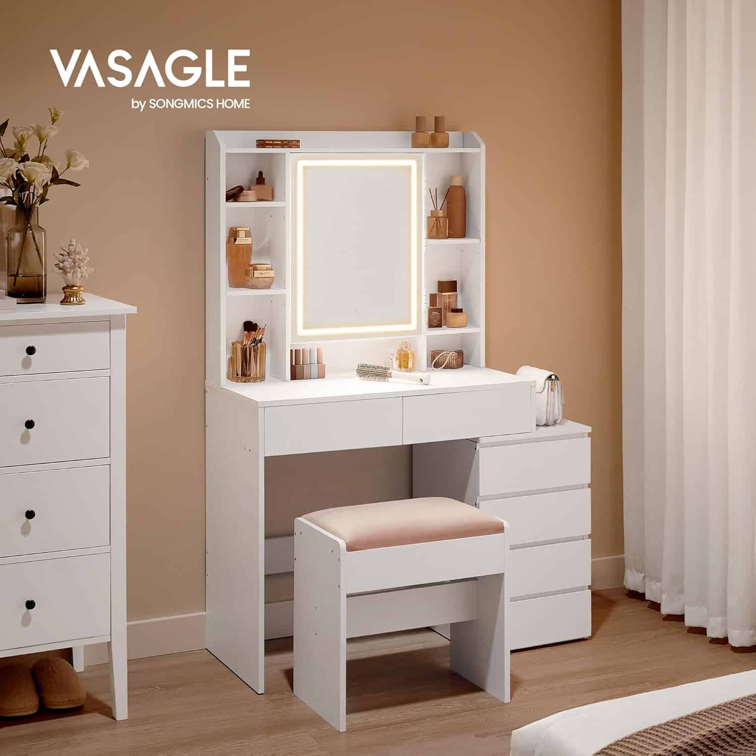 VASAGLE Masa de toaleta cu taburet si oglinda, iluminare LED reglabila, 6 sertare, 98x40x145 cm, alb Mob360