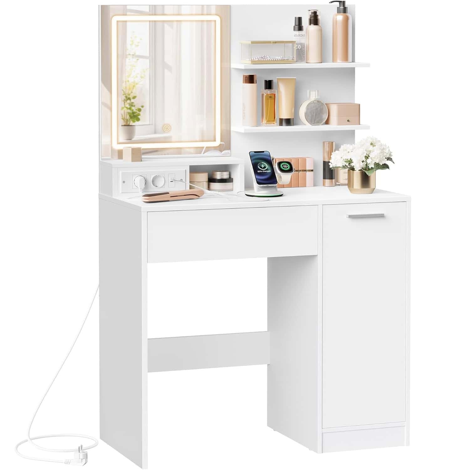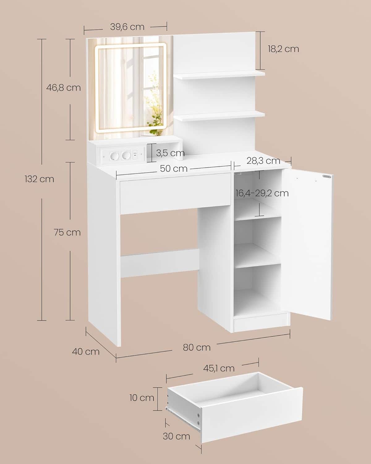 VASAGLE Masa de toaleta Kailyn cu oglinda LED si priza integrata, porturi USB, sertar, rafturi si dulap, PAL, 80x40x132 cm, alb Mob360