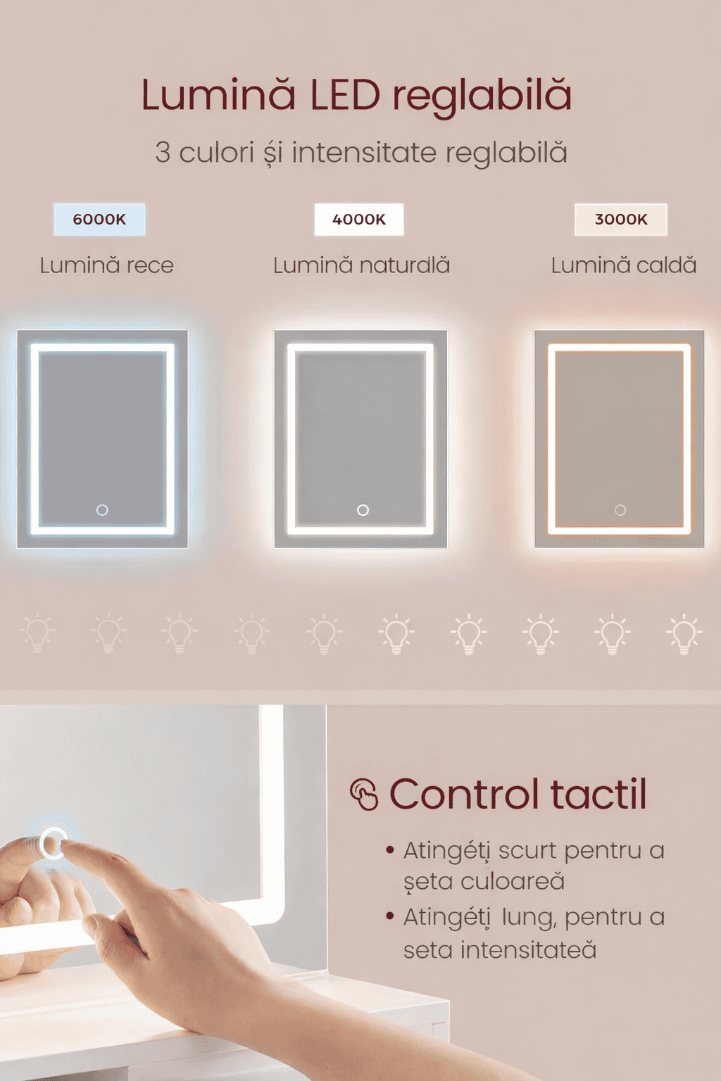 - Cu iluminare LED integrataTip iluminare: 3 culori, control tactil