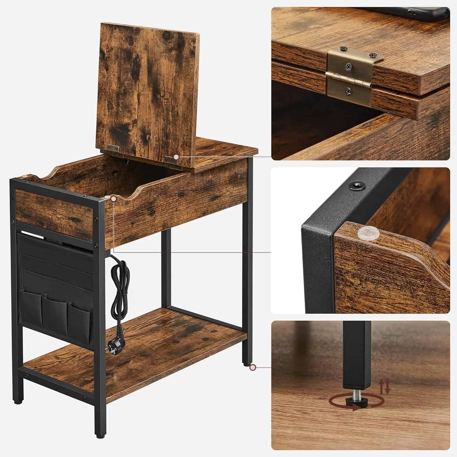 VASAGLE Masa laterala pliabila, tip noptiera, cu prize si porturi USB, raft si geanta din textil, 60x32x60 cm, maro rustic Mob360