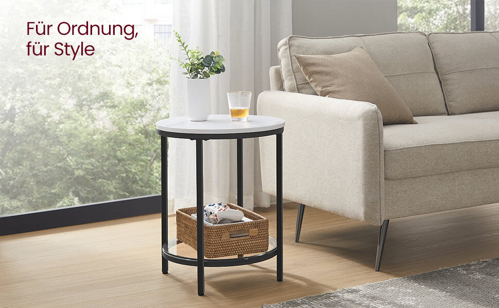 un caracter unic.Solida, stabila si durabila: Cu picioarele solide din otel, placa aglomerata rezistenta, raftul din sticla calita de inalta calitate si picioarele reglabile, aceasta masa laterala ofera o fixare stabila si fiabila (fiecare raft poate sustine pana la 10 kg).Tineti la indemana ceasca, telecomanda, telefonul mobil si revistele cu cele doua rafturi deschise.