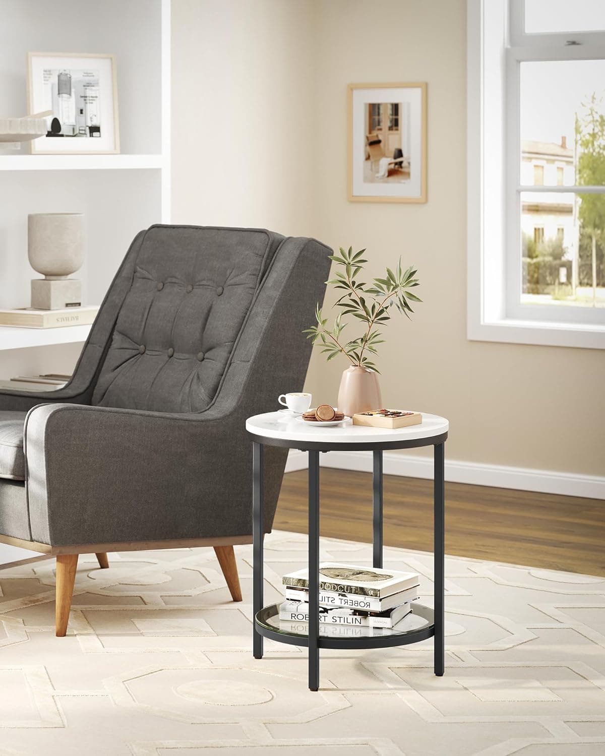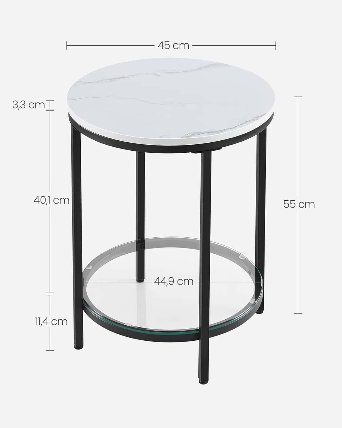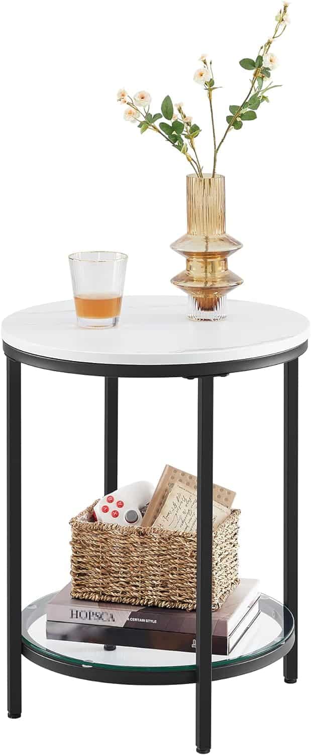 VASAGLE Masa rotunda, cu cadru de otel, noptiera, 45x55cm, negru cu blat alb aspect marmura Mob360