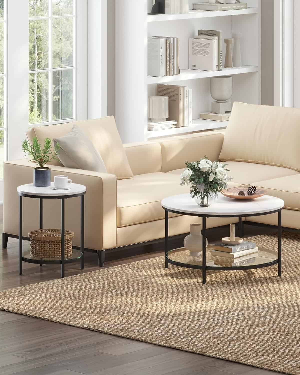 VASAGLE Masa rotunda, cu cadru de otel, noptiera, 45x55cm, negru cu blat alb aspect marmura Mob360 este disponibil în magazinul Mob360.