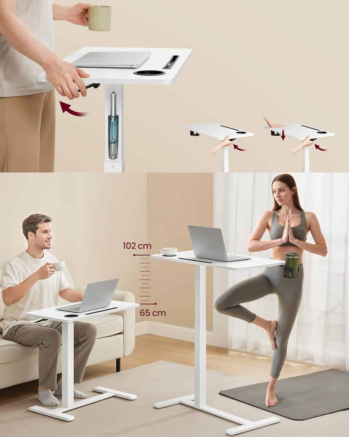 VASAGLE Masa tip birou, ajustabila cu roti pentru pat sau canapea, blat 70×40 cm, inaltime reglabila 65-102 cm, alb Mob360