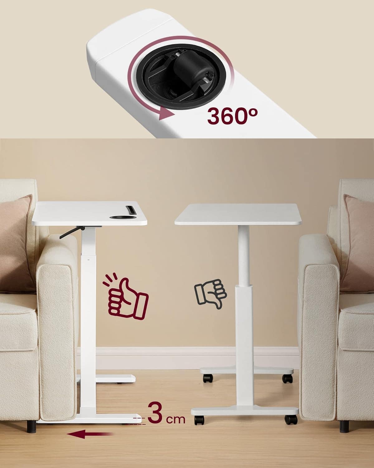 - Masa multifunctionala cu inaltime reglabila, conceputa pentru utilizare langa pat, canapea sau fotoliu. Sistemul cu arc pe gaz permite ajustarea usoara a inaltimii cu o singura mana, iar rotile asigura mobilitate rapida si economisirea spatiului. Caracteristici principale: