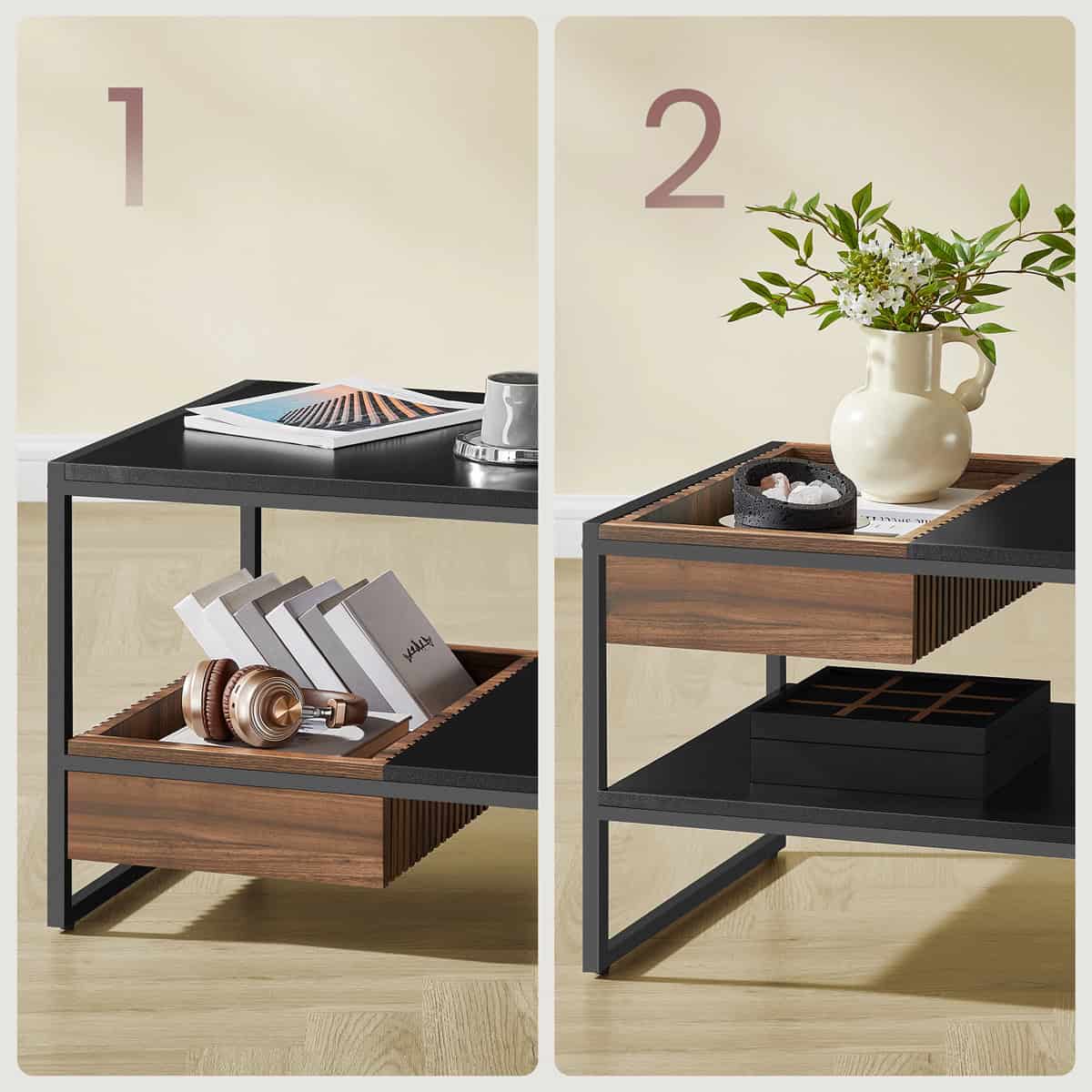 - Aceasta masuta de cafea VASAGLE este alegerea perfecta pentru un living modern si elegant. Cu un design industrial echilibrat de nuante sobre si materiale rezistente, include un sertar glisant versatil si un raft inferior spatios, pentru depozitare eficienta si stil contemporan. Caracteristici principale: