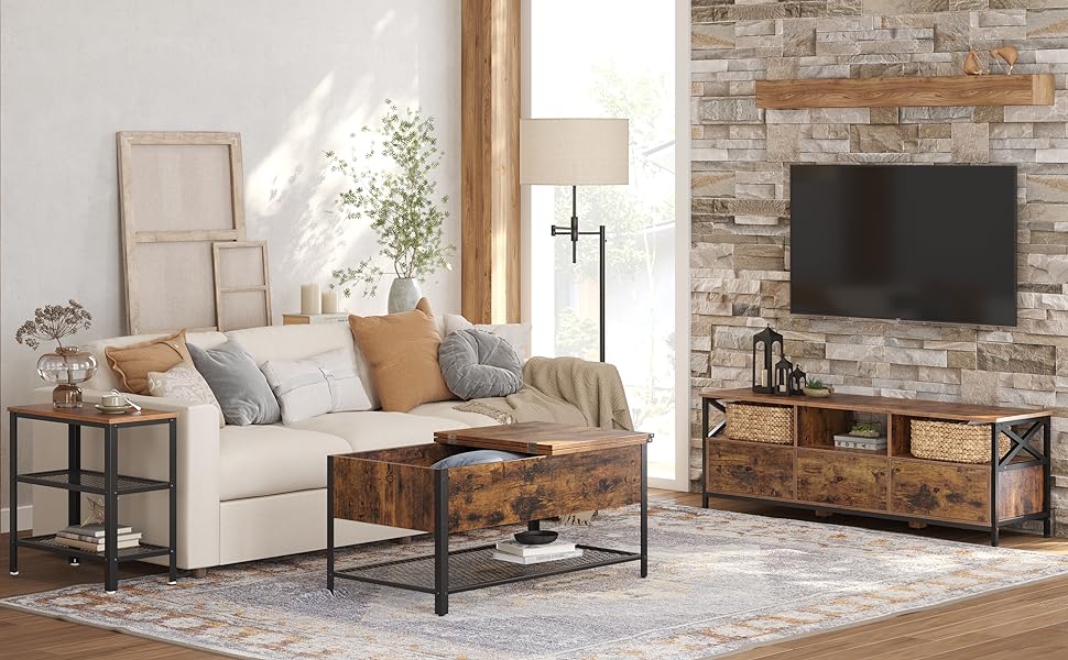 VASAGLE Masuta de cafea cu capac rabatabil, compartiment depozitare ascuns si raft plasa, industrial, 100x55x47cm, maro rustic si negru Mob360