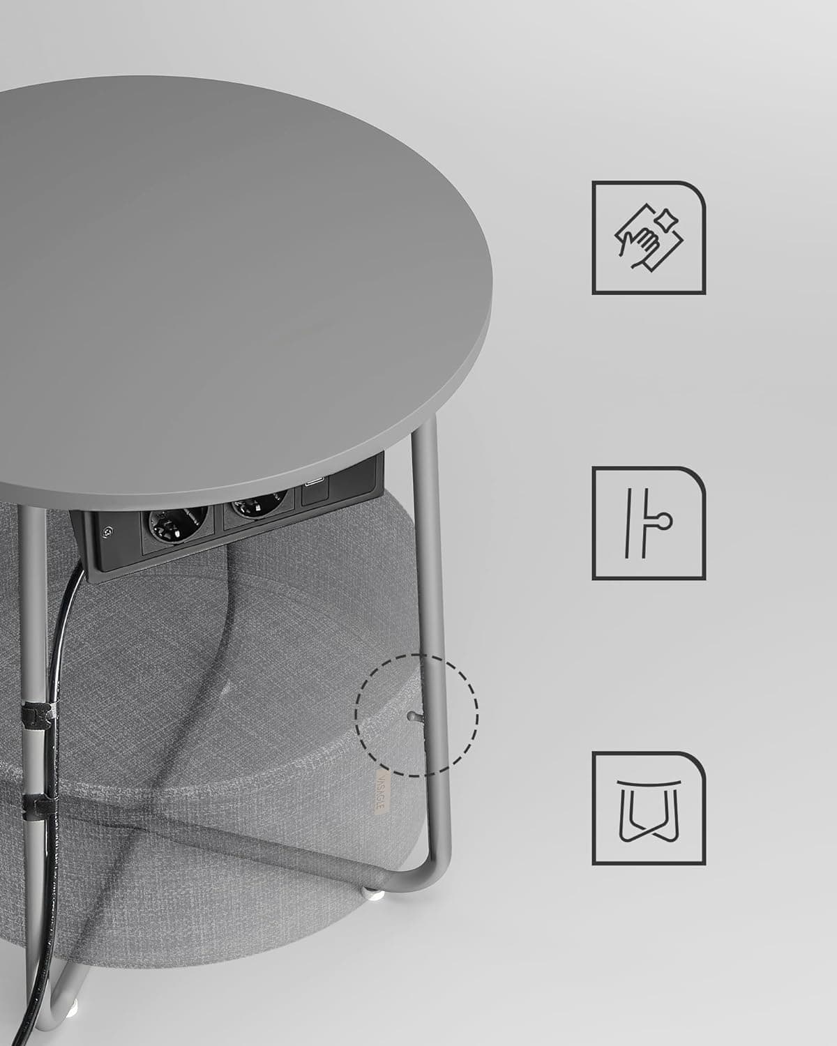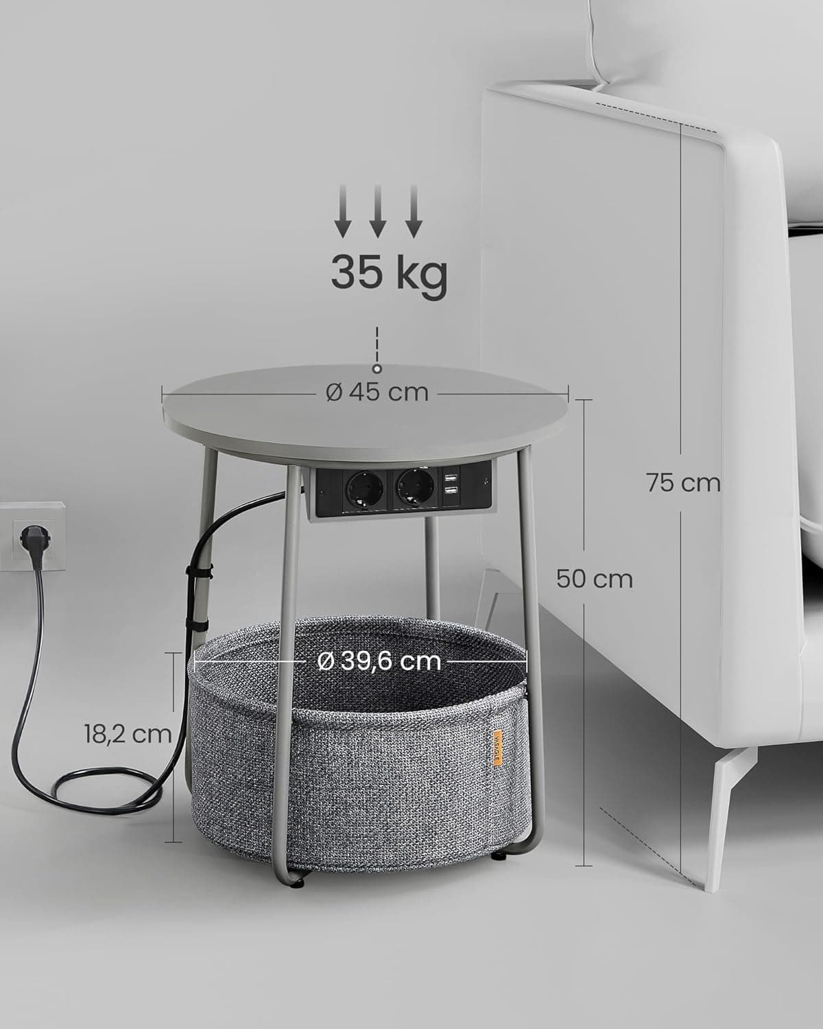 VASAGLE Masuta de cafea rotunda cu cos de stofa, statie de incarcare 2 prize si 2 USB, 45x50cm, gri argintiu Mob360 – produs disponibil în magazinul Mob360.