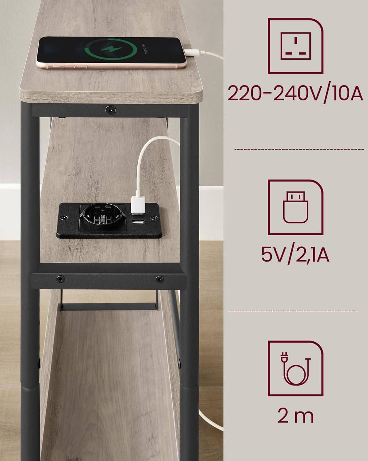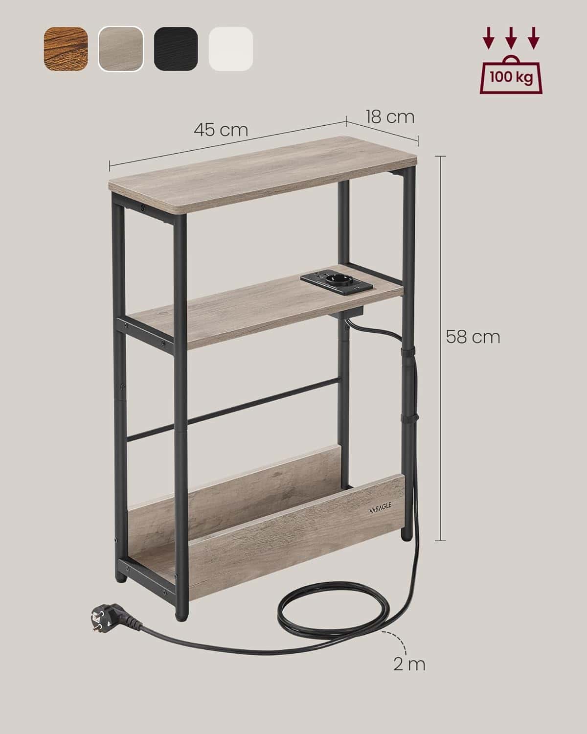 VASAGLE Masuta ingusta cu priza si porturi de incarcare USB, 3 rafturi, 45x18x58 cm, gri Mob360