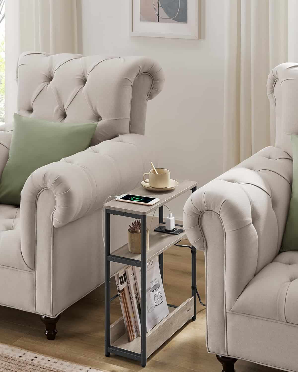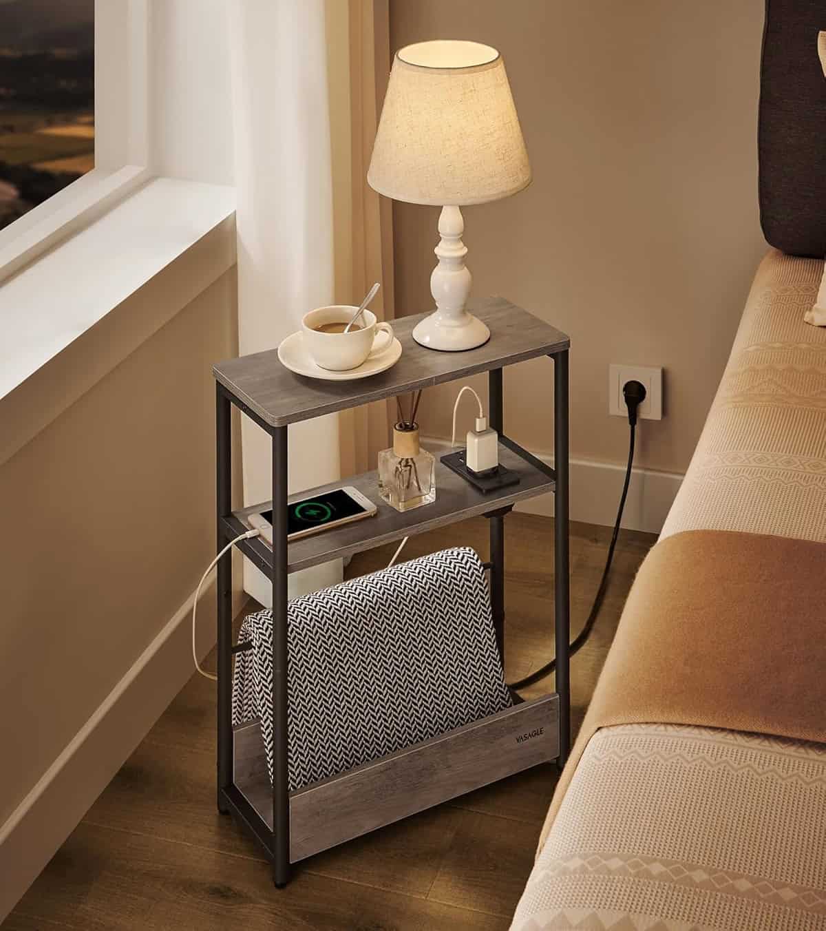 - Cu un design compact si inteligent, masuta laterala VASAGLE in nuanta greige se potriveste perfect in spatii mici. Include 3 rafturi, suport lateral pentru reviste si o statie de incarcare integrata, fiind ideala langa pat, canapea sau in birou. Caracteristici principale: