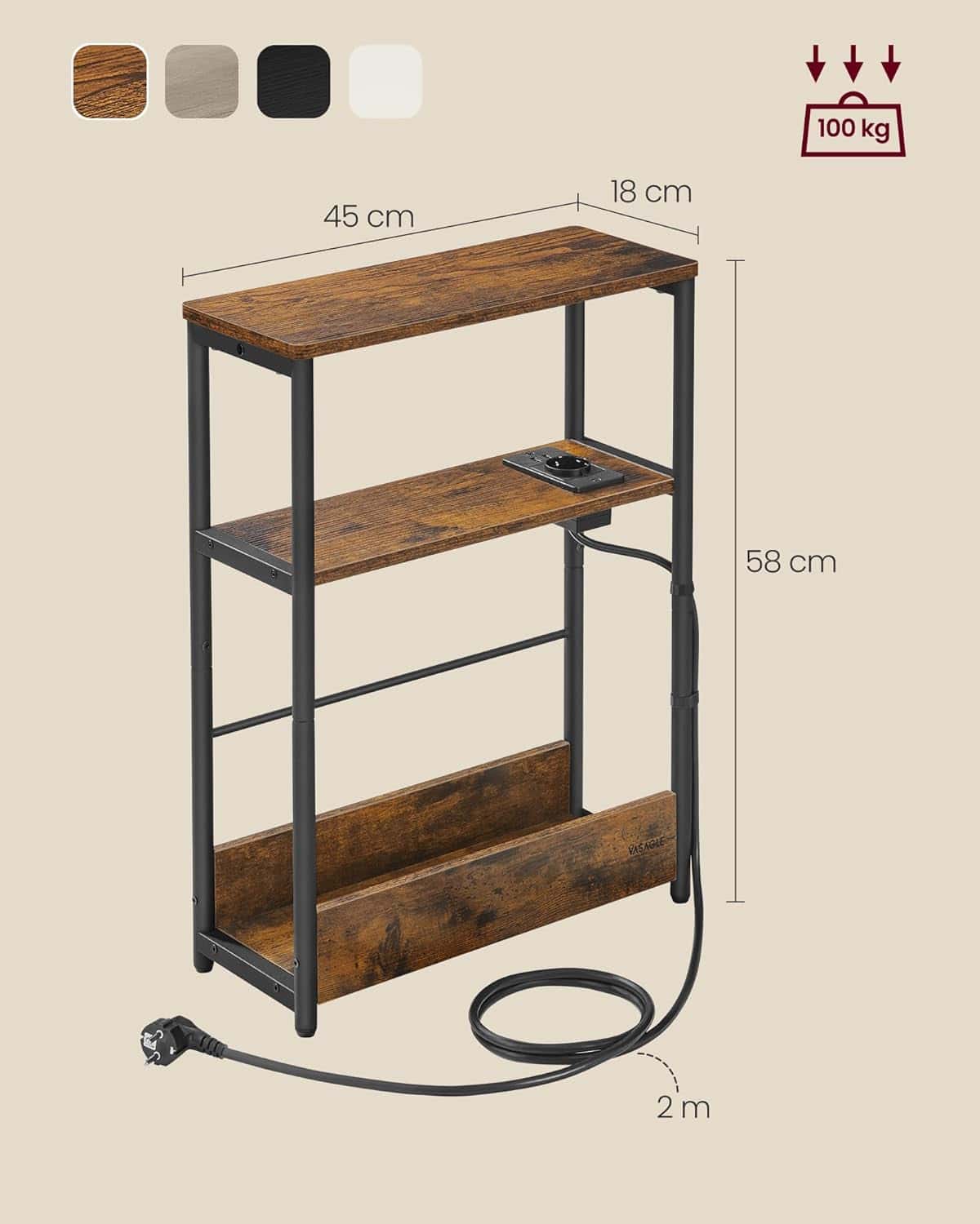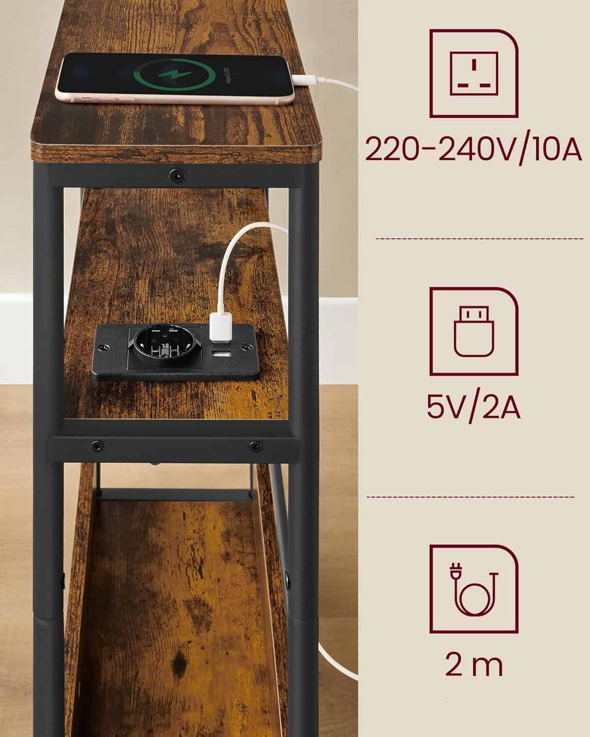 VASAGLE Masuta ingusta cu priza si porturi de incarcare USB, 3 rafturi, 45x18x58 cm, maro rustic Mob360
