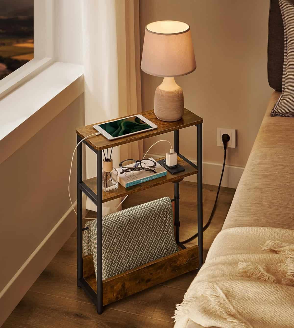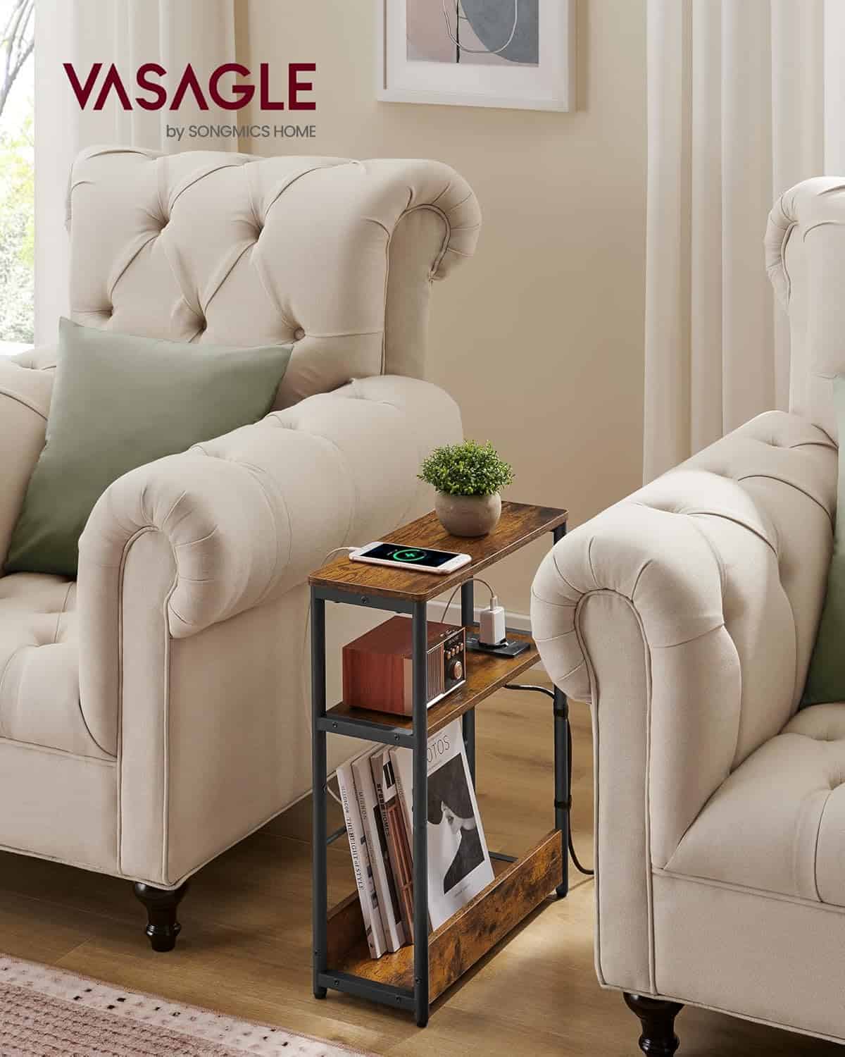 - Aceasta masa laterala VASAGLE este solutia perfecta pentru spatii restranse, avand o latime de doar 18 cm. Dotata cu statie de incarcare integrata (1 port AC si 2 porturi USB), este ideala pentru dormitor, birou sau living. Cu 3 rafturi si suport lateral pentru reviste, ofera spatiu practic de depozitare. Caracteristici principale: