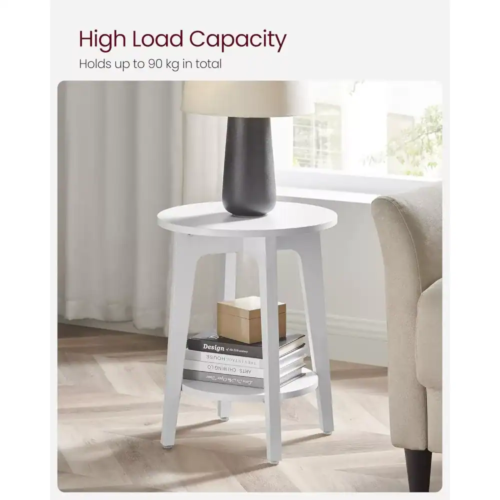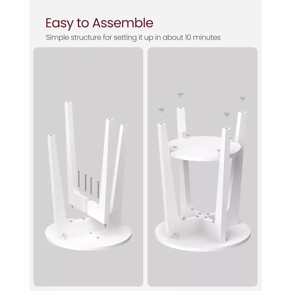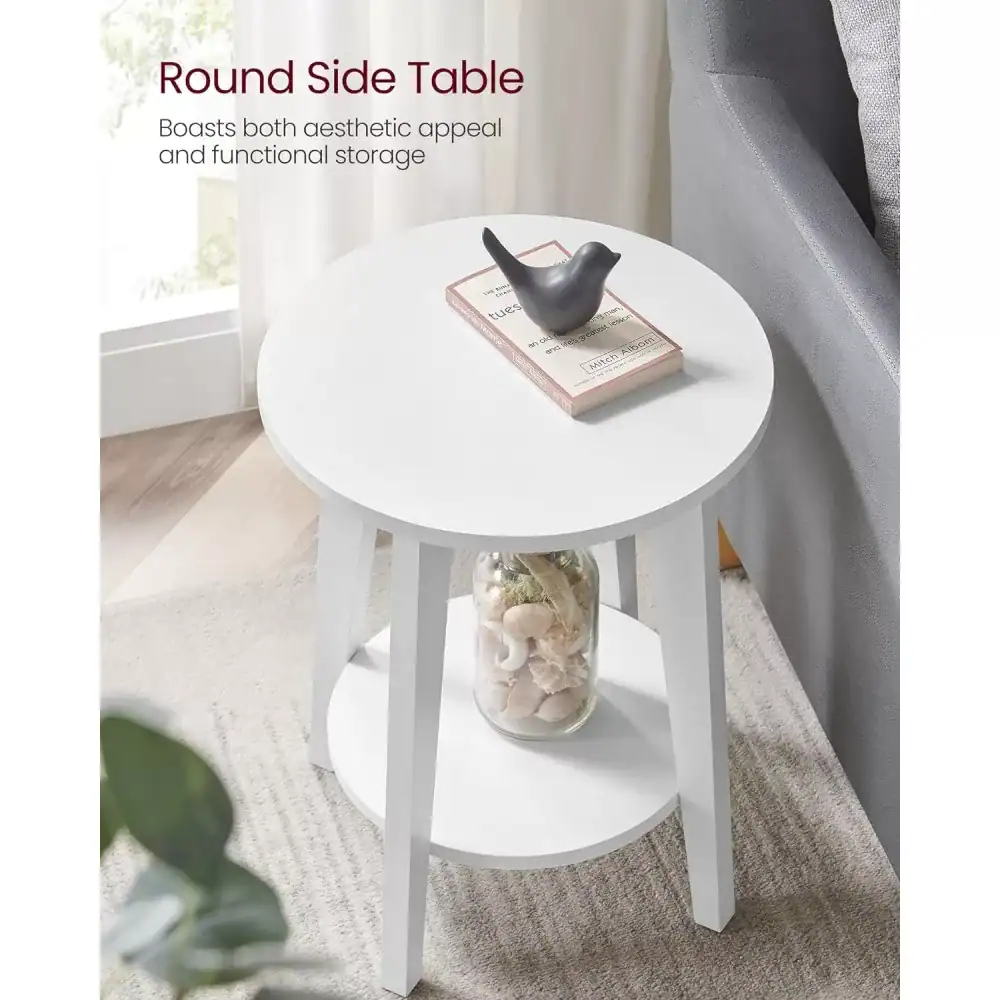 - Masuta laterala VASAGLE este o piesa practica si eleganta, ideala pentru living, dormitor sau spatii mici. Designul rotund, culoarea alba si liniile curate ii permit sa se integreze usor in interioare moderne. Blatul superior si raftul inferior ofera spatiu suficient pentru carti, decoratiuni sau obiecte de zi cu zi. Caracteristici principale: