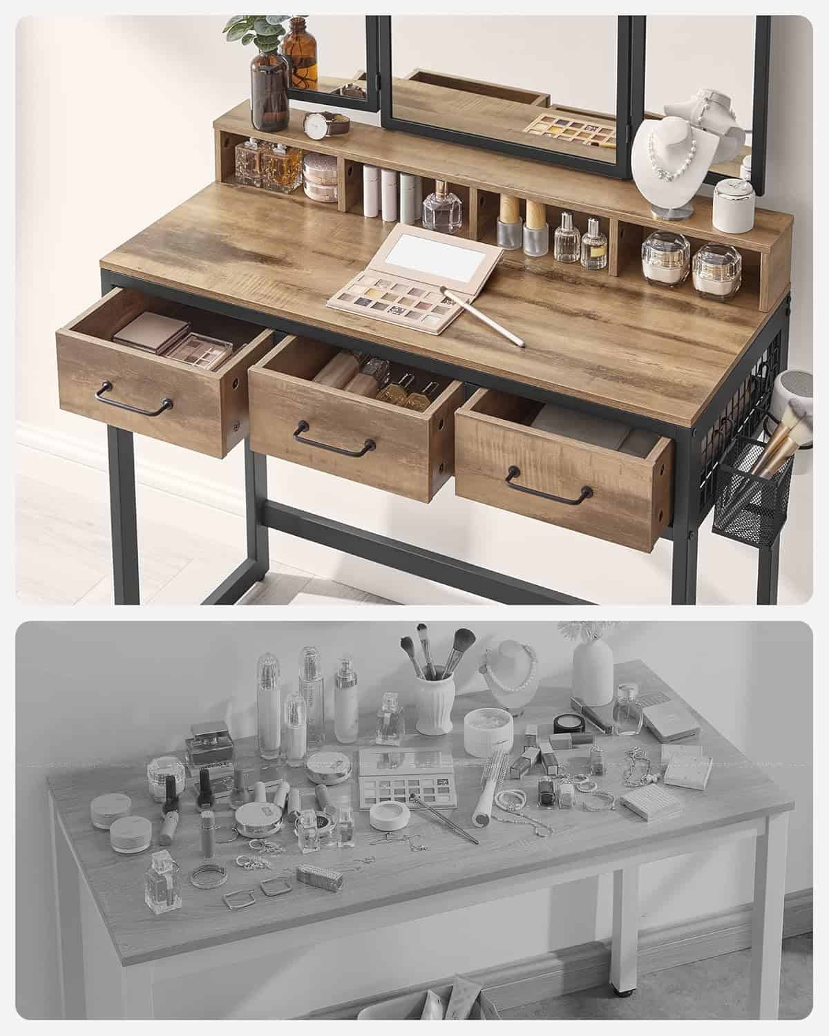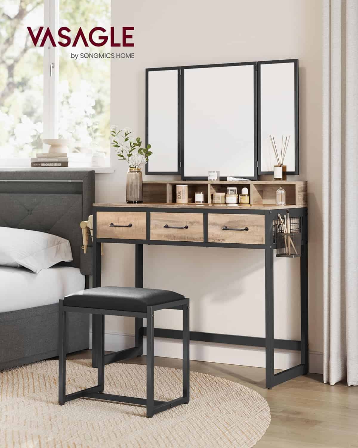VASAGLE Masuta toaleta 90x40x141 cm, cu 3 sertare, oglinda tripla si taburet, lemn si otel, maro stejar si negru Mob360