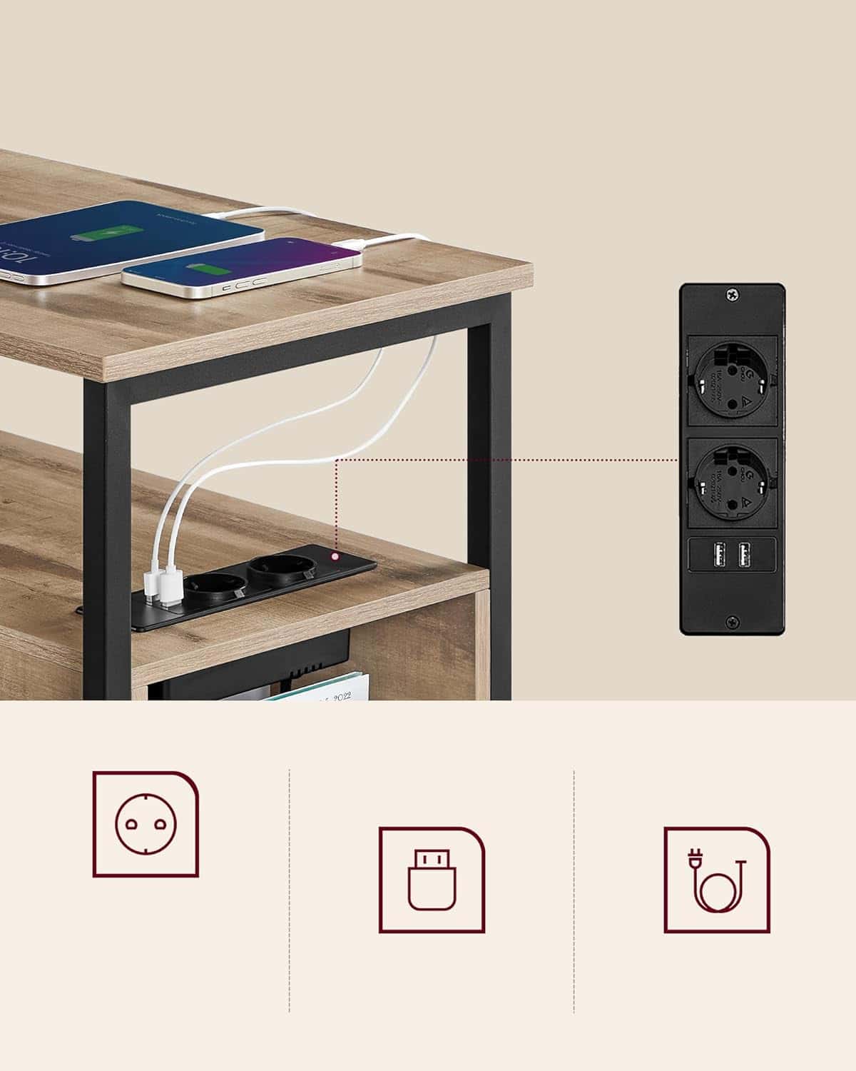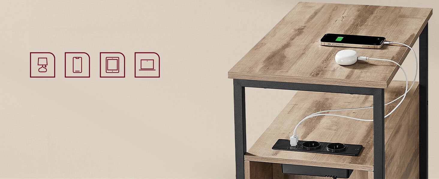 VASAGLE Noptiera 60x35x61 cm, cu 2 sertare, rafturi si priza incorporata, PAL si otel, maro Mob360