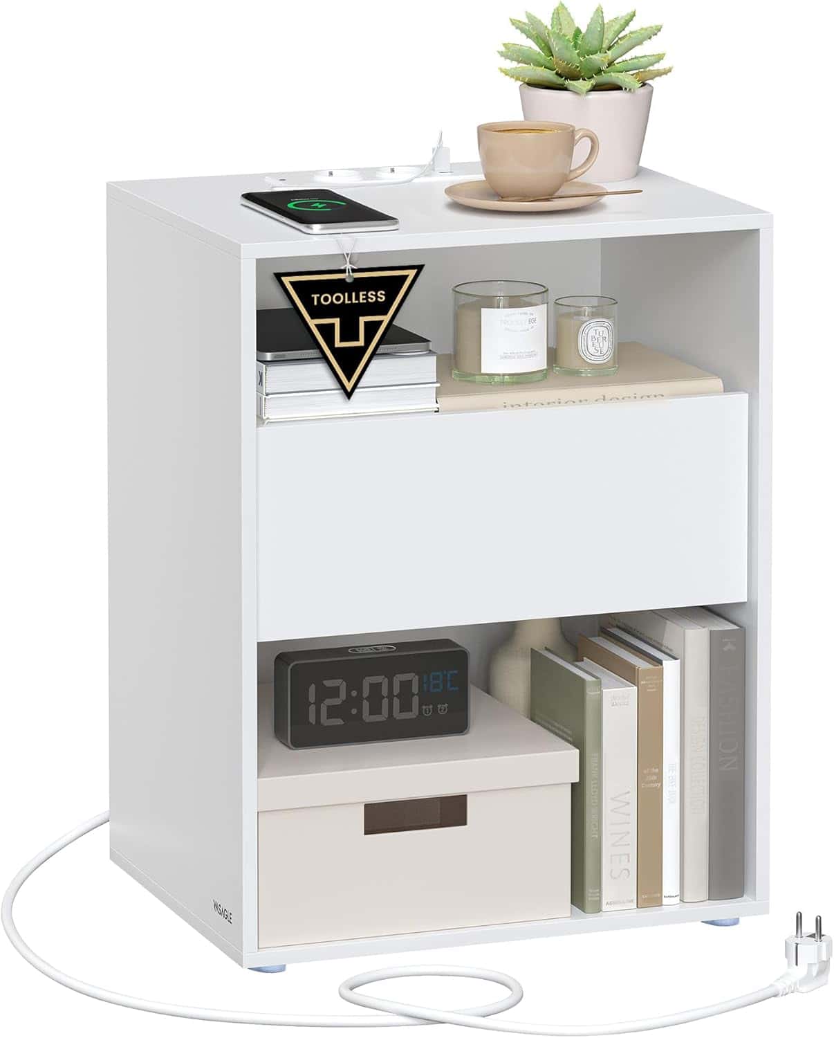Specificatii tehnice Tip produs: Noptiera / masuta lateralaMaterial: PALMaterial blat: LemnCuloare: alb matDimensiuni: 45 x 35 x 58 cmSarcina maxima suportata: 59 kgCompartimente deschise: 2Alimentare: 2 prize AC, 2 porturi USBLungime cablu: 2 m Scurta descriere Noptiera VASAGLE este conceputa pentru confort zilnic si organizare eficienta. Sistemul de asamblare fara unelte permite montaj rapid, iar statia de incarcare integrata iti ofera acces facil la energie direct langa pat. Designul modern si culoarea alb mat se integreaza usor in orice dormitor. Caracteristici principale Asamblare ultra-rapida fara unelte Statie de incarcare cu prize si porturi USB integrate Sertar cu sistem de siguranta impotriva extragerii accidentale Doua compartimente deschise pentru acces rapid Structura stabila si rezistenta pentru utilizare zilnica Design modern, minimalist, potrivit pentru dormitor sau living