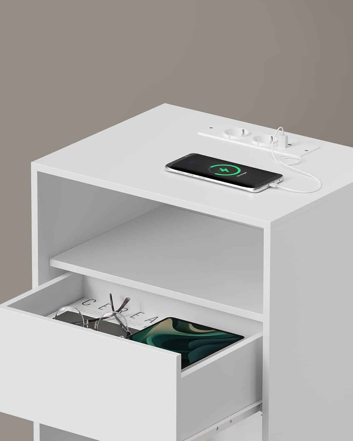 VASAGLE Noptiera cu sertar si statie de incarcare, 2 prize, 2 porturi USB, 45x35x58 cm, alb Mob360 – produs disponibil în magazinul Mob360.