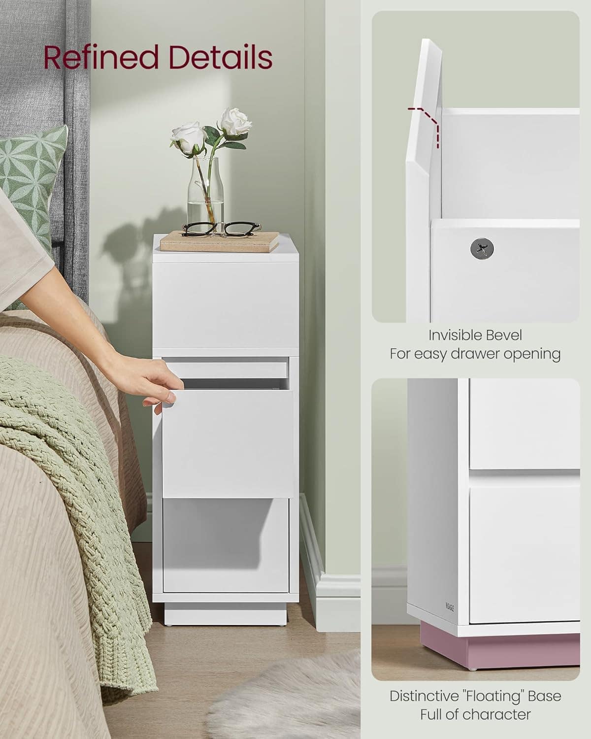 VASAGLE Noptiera ingusta cu 2 sertare, montaj stanga – dreapta, 30x25x65 cm, alb Mob360 – produs disponibil în magazinul Mob360.