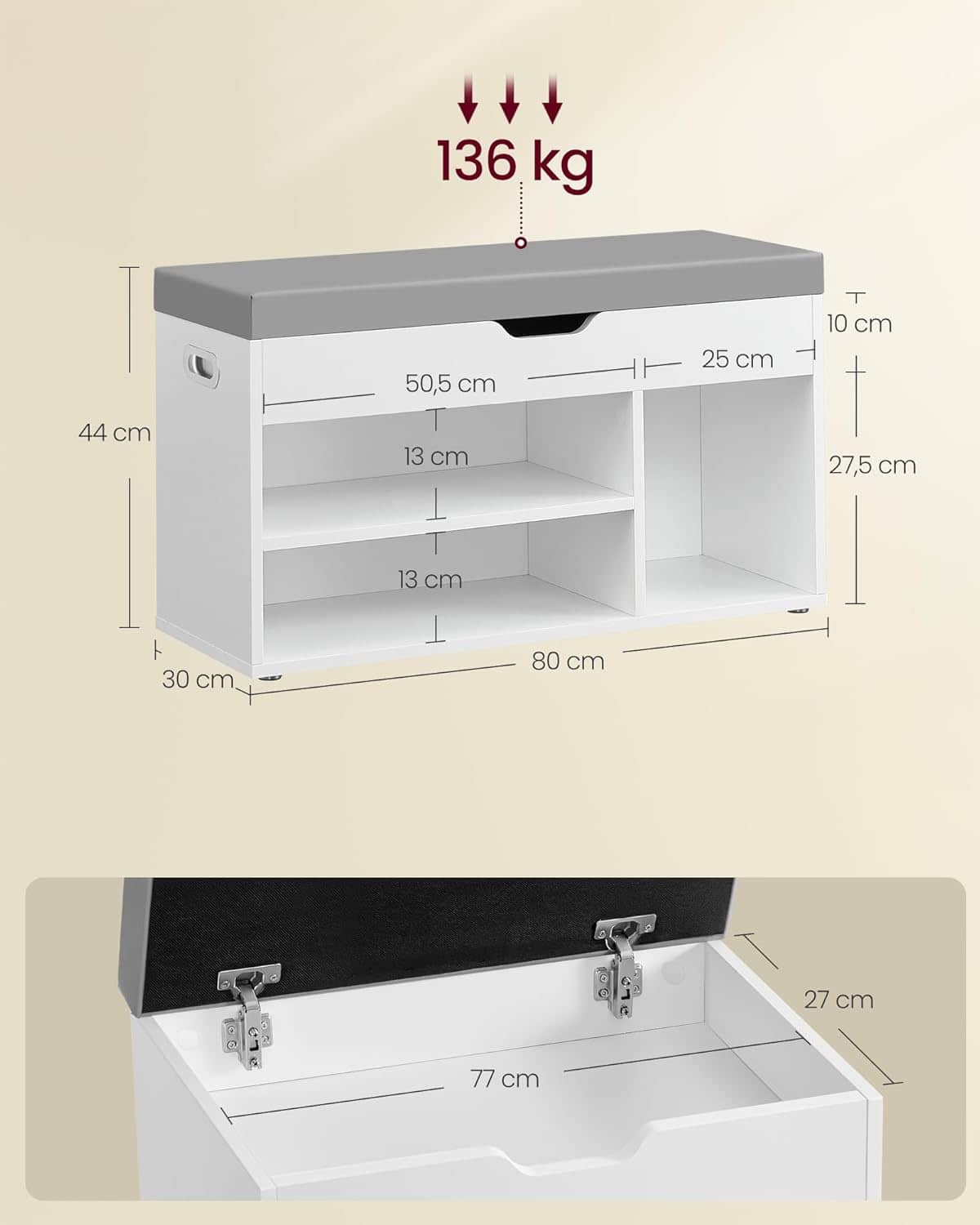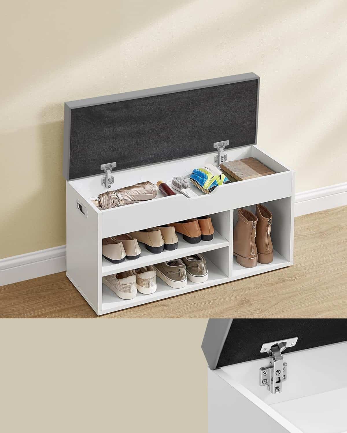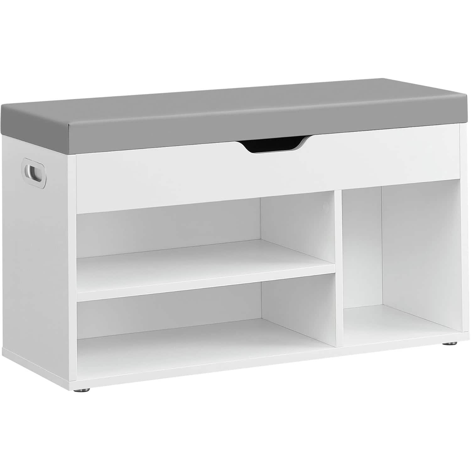 VASAGLE Pantofar cu banca, capitonata, 3 compartimente, sarcina 150 kg, 30x80x44 cm, modern, alb Mob360