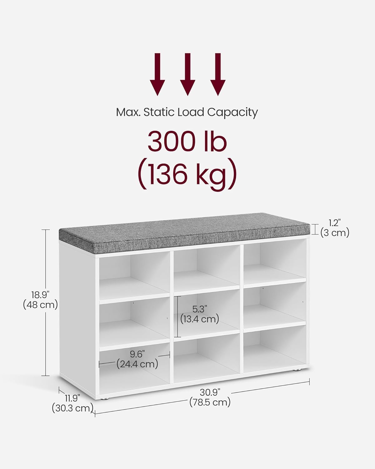 VASAGLE Pantofar cu banca cu 9 compartimente si perna, sarcina 136 kg, 79x30x48 cm, alb Mob360