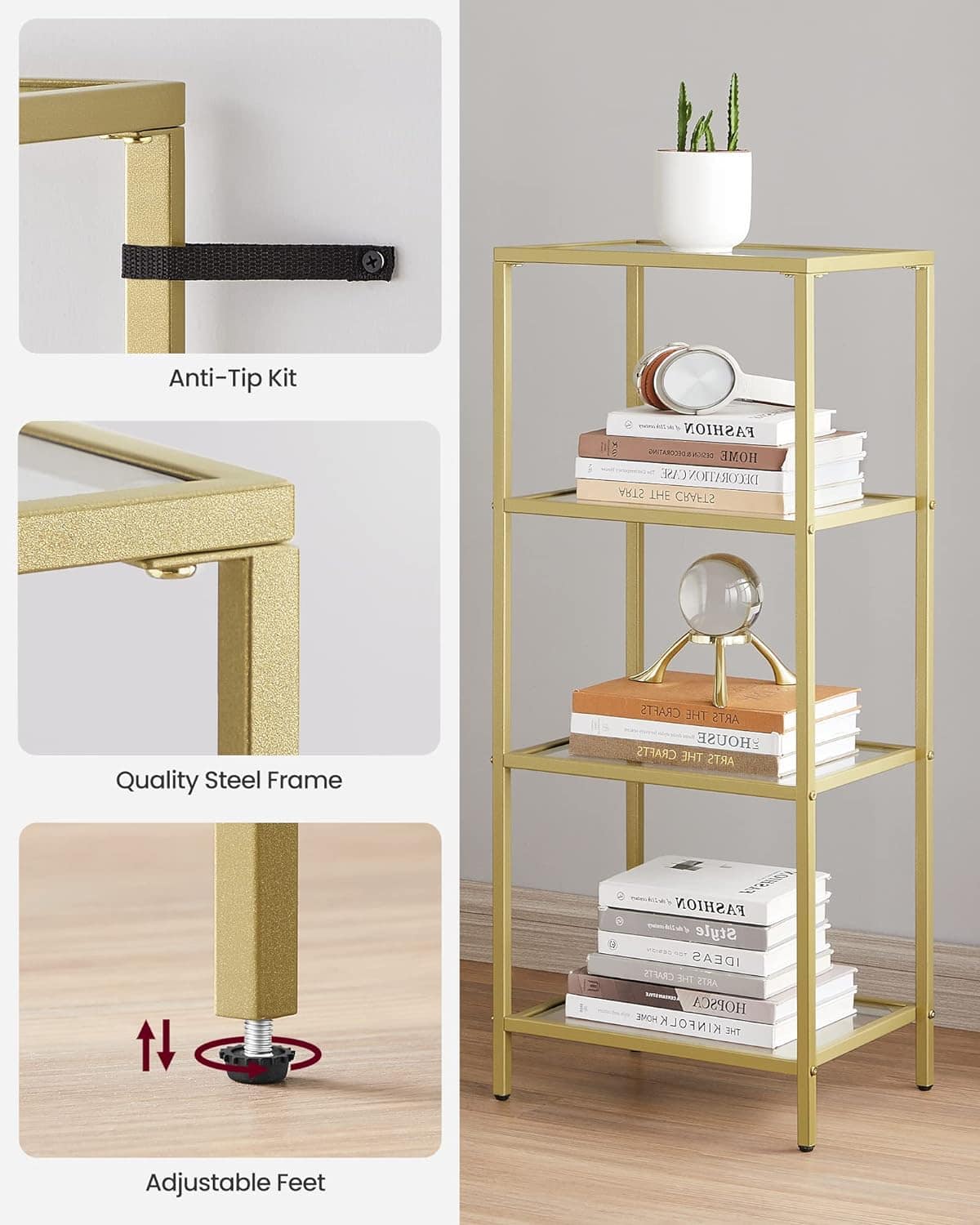 VASAGLE Raft cu trepte pentru dormitor, 4 etaje, din sticla securizata, cadru din otel, 30x95x40cm, auriu Mob360