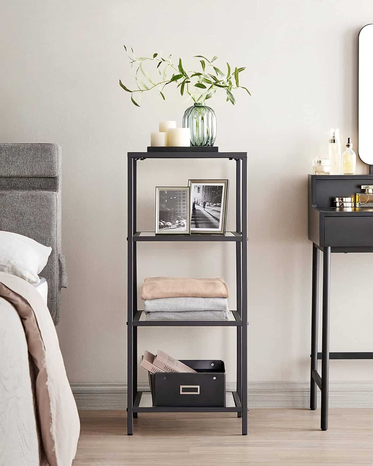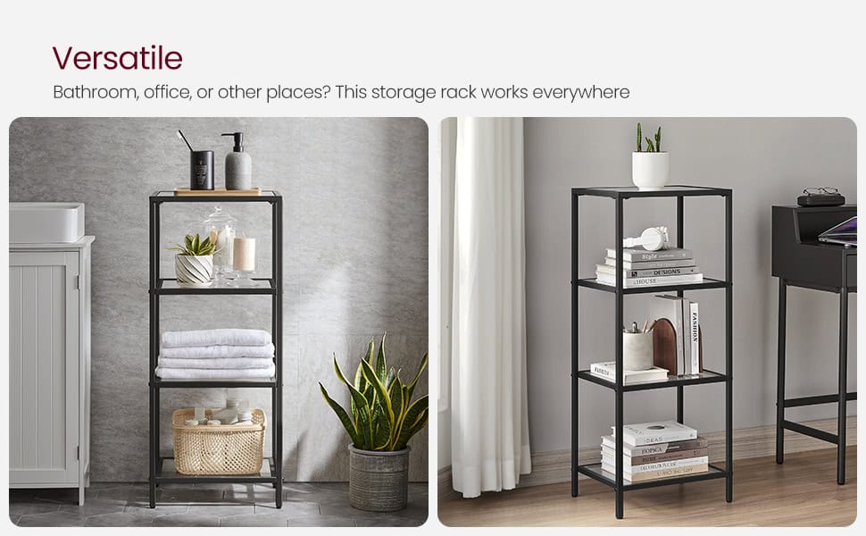 VASAGLE Raft cu trepte pentru dormitor, 4 etaje, din sticla securizata, cadru din otel, 30x95x40cm, negru Mob360