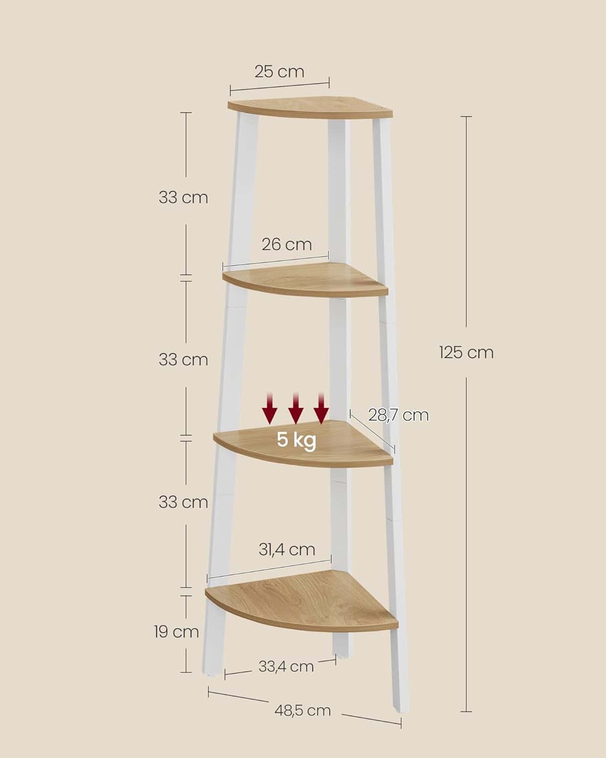 Culoare: stejar natural alb matMaterial: placi aglomerate PAL, otelDimensiuni: 33,4 x 33,4 x 125 cm (D x L x H)Greutate: 5,5 kgCapacitate maxima de incarcare statica per raft: 5 kg Livrare: 1 x raft de colt1 x pachet de accesorii1 x dispozitiv anti-basculare1 x manual de instructiuni Note VASAGLE: Va rugam sa atasati acest produs la perete cu ajutorul protectiei anti-inclinare incluse pentru a asigura o utilizare sigura. Un raft pentru orice camera Umpleti colturile goale din camera de zi, folositi-l ca raft de colt in camera de studiu pentru plante sau puneti-l in intrare, sufragerie sau dormitor… acest raft de colt este foarte versatil Utilizati la maxim spatiul din colturi Cu o dimensiune de 33,4 x 33,4 x 125 cm, acest raft cu scara cu 4 niveluri permite utilizarea completa a spatiului din colt pentru a gazdui decoratiuni, carti, rame foto si multe altele Usor de instalat: Datorita instructiunilor clare, pieselor etichetate si gaurilor pentru suruburi pre-perforate in tijele metalice, acest raft de colt poate fi instalat in cel mai scurt timp Stabilitate maxima Cu o structura cu 3 picioare (unul cu picior reglabil), acest raft de depozitare sta stabil pe podea si se potriveste cu peretele, in timp ce protectia la inclinare garanteaza o utilizare sigura Elegant Cu rafturile sale din stejar natural si rama metalica alba, acest raft adauga o nota de stil industrial casei dvs.