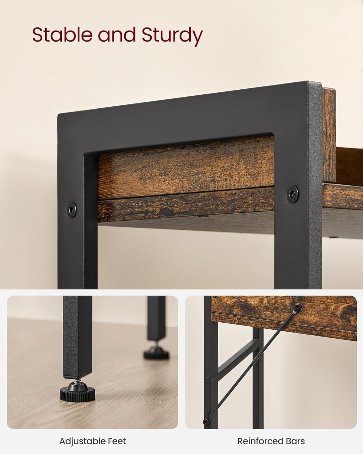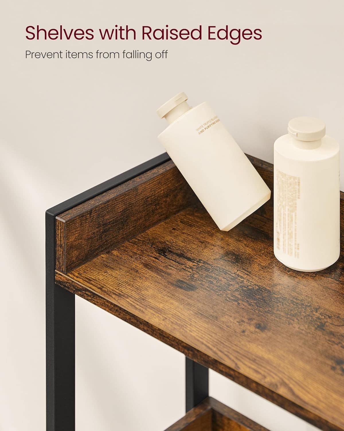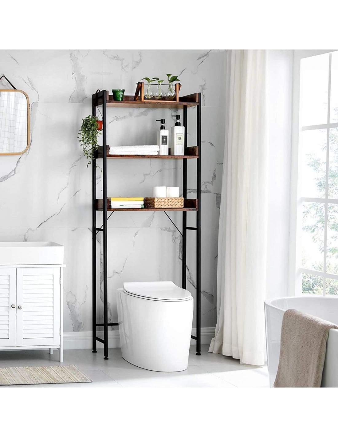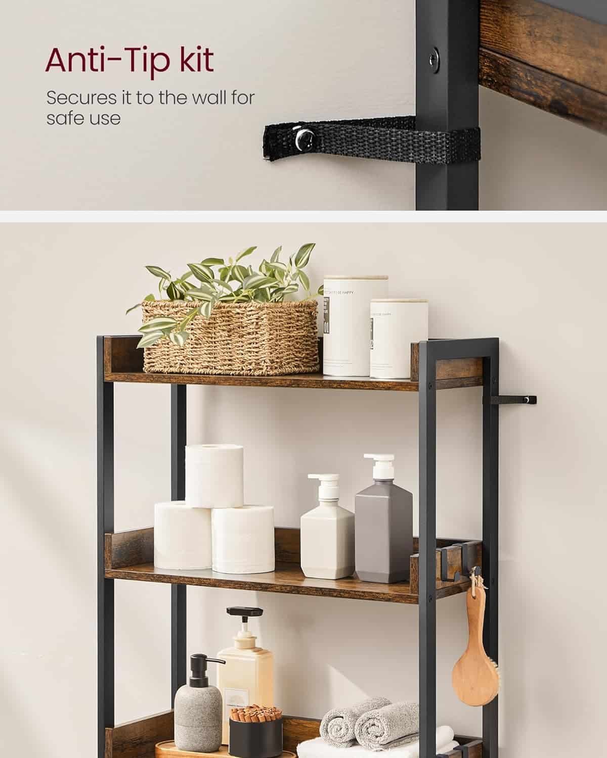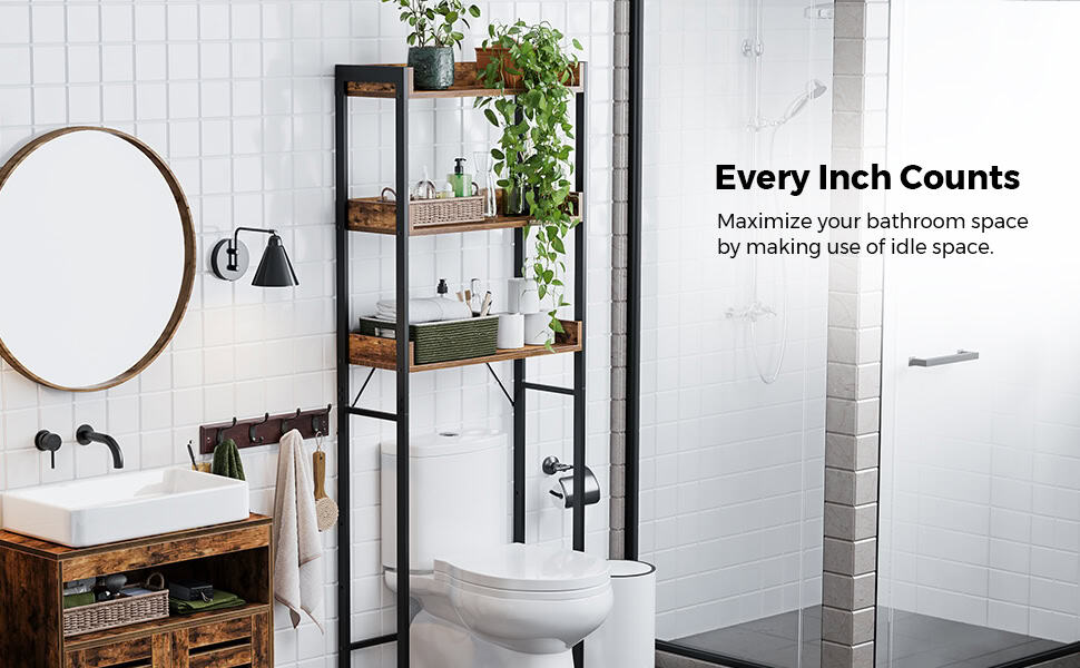 Specificatii: Culoare: maro rustic, negru Material: Placi aglomerate, otel Dimensiuni totale: 25 x 63 x 165 cm Greutatea produsului: 10,2 kg Capacitate de incarcare statica totala: 15 kg Despre acest articol Cu 3 rafturi, acest raft de baie deasupra toaletei foloseste bine spatiul deja ocupat pentru a oferi o multime de spatiu de depozitare suplimentar pentru organizarea articolelor de toaleta sau pentru afisarea decoratiunilorAmestecul de placi aglomerate si un cadru din otel confera acestui raft pentru baie o structura robusta; kitul antiinclinare ajuta la asigurarea stabilitatii, iar marginile ridicate din jurul fiecarui raft impiedica obiectele sa cada de pe elDatorita pieselor numerotate si a instructiunilor clare care va ghideaza pe parcursul asamblarii, asamblarea acestui raft de deasupra toaletei este usor-usor de realizatAvand culori rustice maro si negru si linii curate, acest organizator pentru baie deasupra toaletei cu un farmec industrial va adauga cu usurinta un caracter unic spatiului dvs.Nu numai ca un raft pentru toaleta, dar se poate potrivi, de asemenea, peste o masina de spalat, un cos de depozitare sau un cos de gunoi pentru a functiona excelent ca organizator de rufe, suport pentru plante sau raft de bucatarie – totul depinde de dvs.