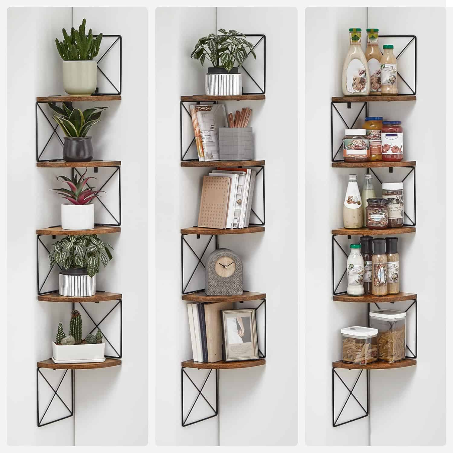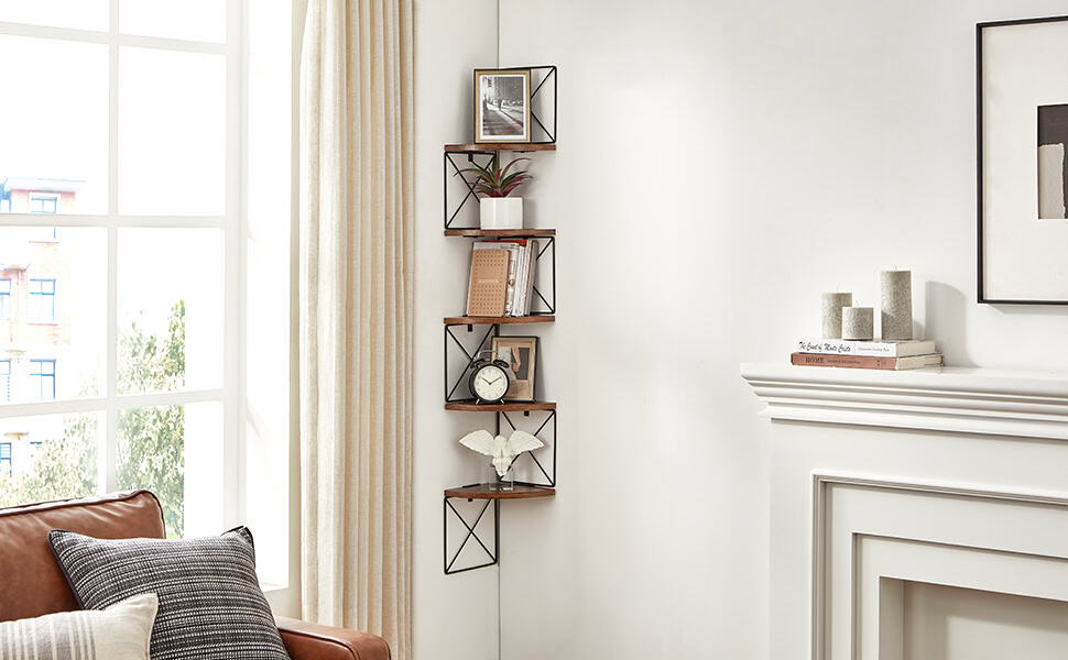 VASAGLE Raft de perete pentru colt, cadru otel cu 5 etaje din MDF, 20x20x128cm, maro rustic si negru Mob360