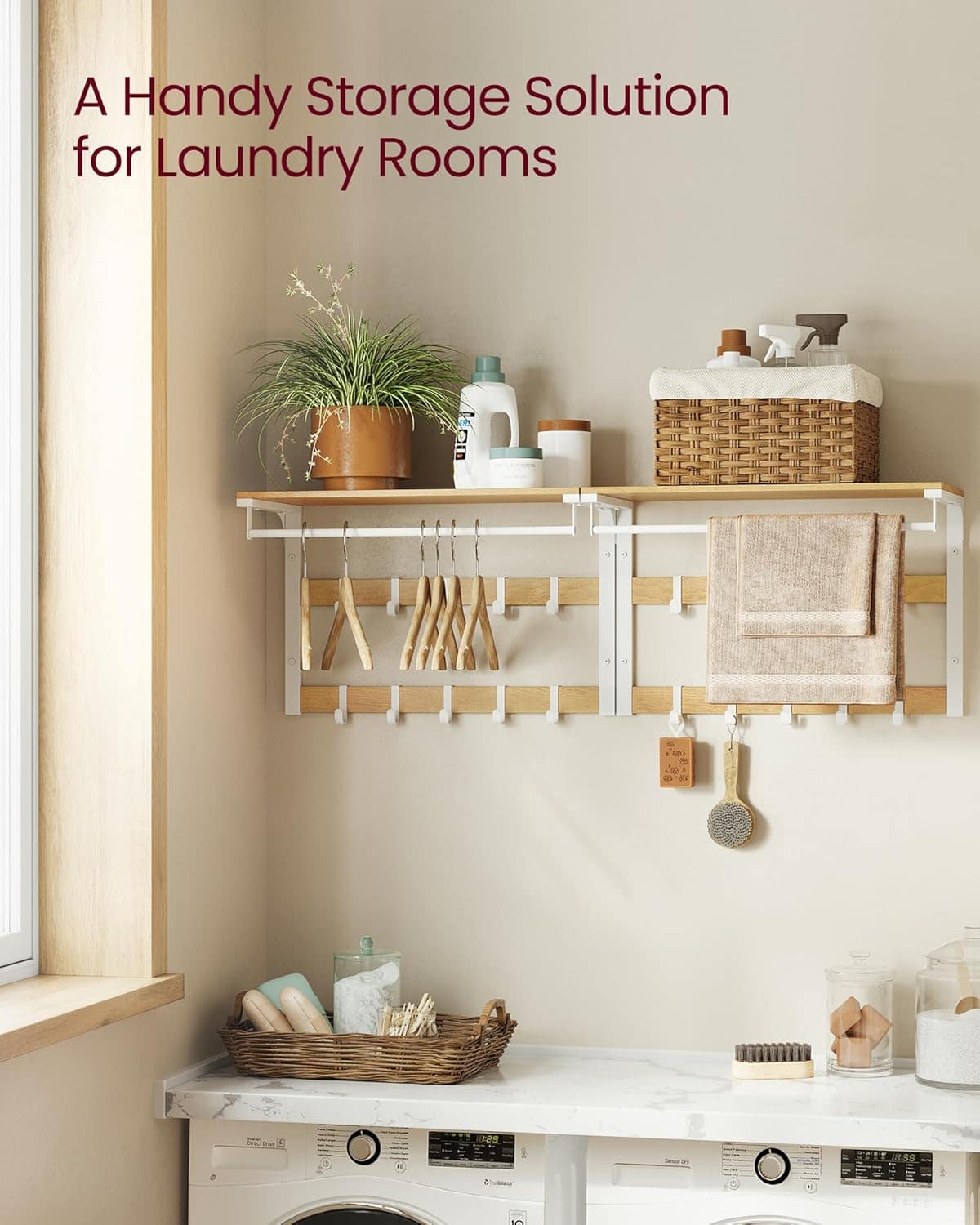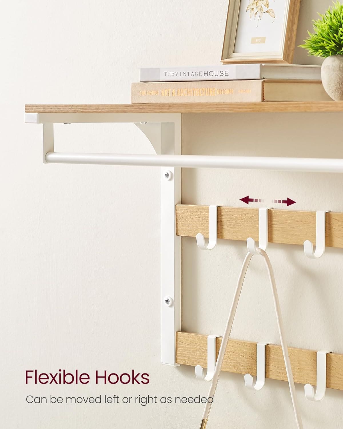 VASAGLE Raft de perete tip cuier, 10 carlige detasabile, sina pentru haine, 30x65x42cm, stejar si alb Mob360