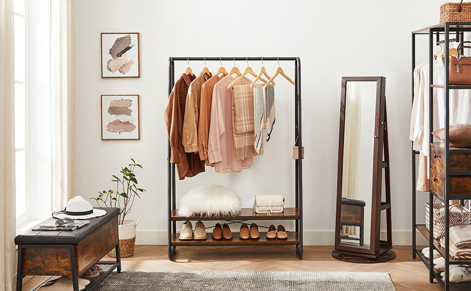 VASAGLE Raft pentru haine cu suport pentru pantofi, 2 polite, 6 carlige laterale, 45x100x160cm, maro rustic Mob360