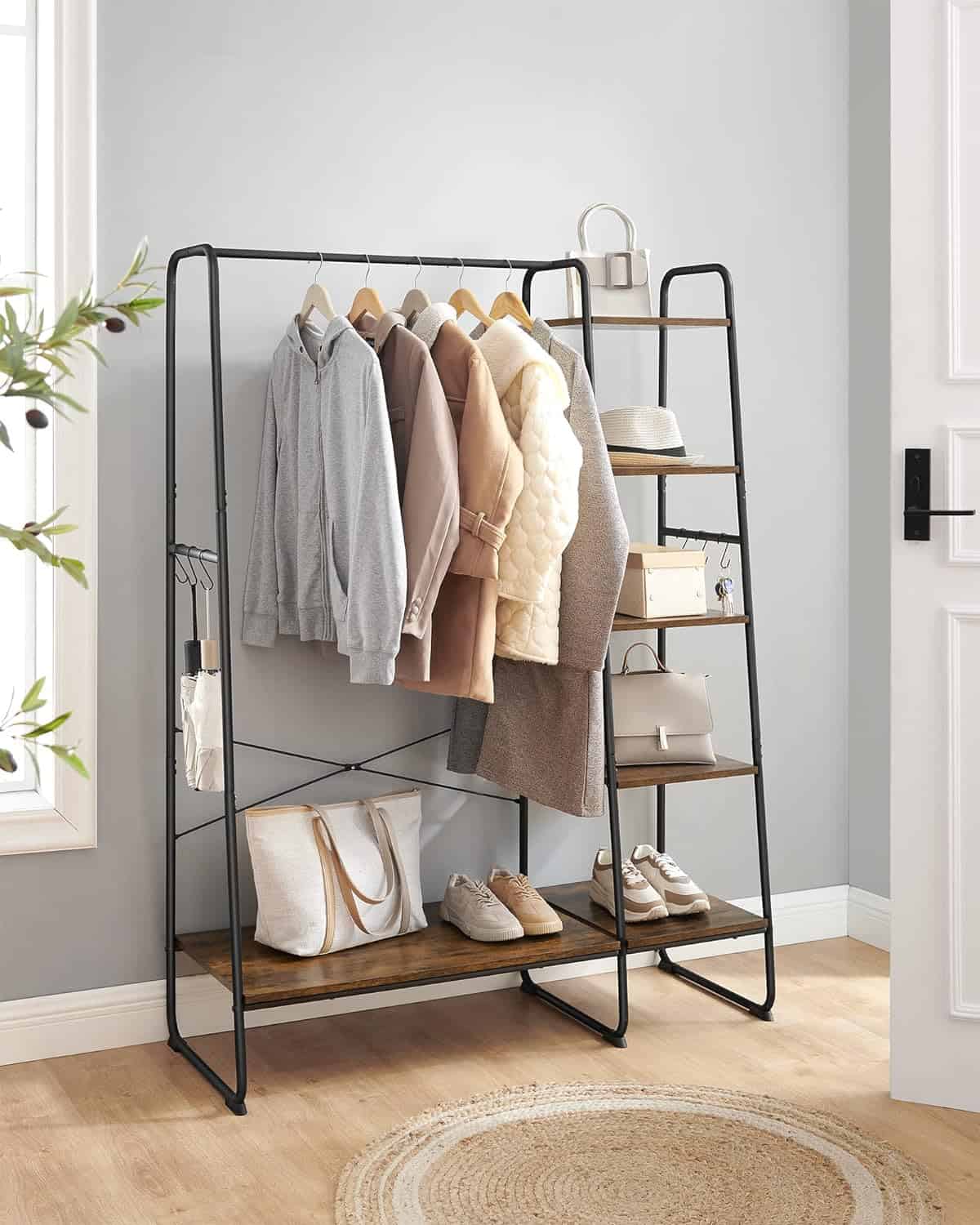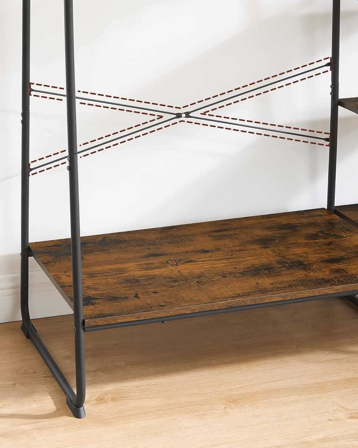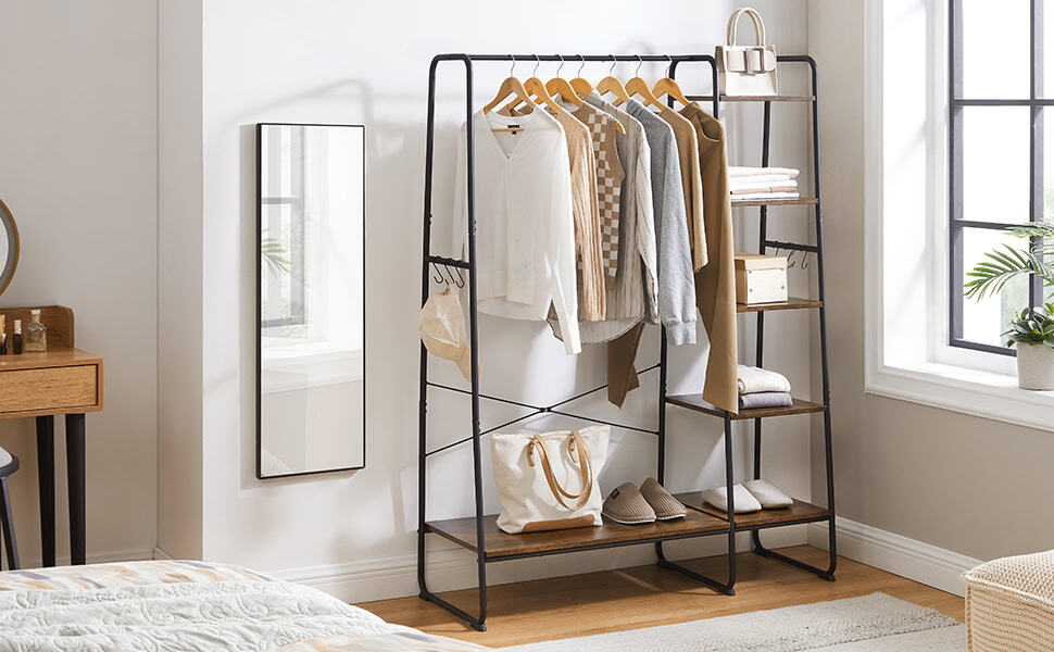 VASAGLE Raft pentru haine cu suport pentru pantofi, 5 polite, 6 carlige laterale, 45x120x160cm, maro rustic si negru Mob360