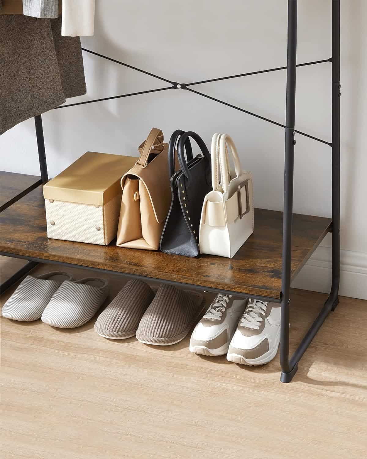 si mult spatiu vertical pentru agatarea hainelor lungi.Stabil si durabil: Fabricat din PAL de calitate si un cadru solid din otel, aceasta sina de haine rezistenta cu suport pentru pantofi suporta pana la 220 kg, gata sa va serveasca an de an.