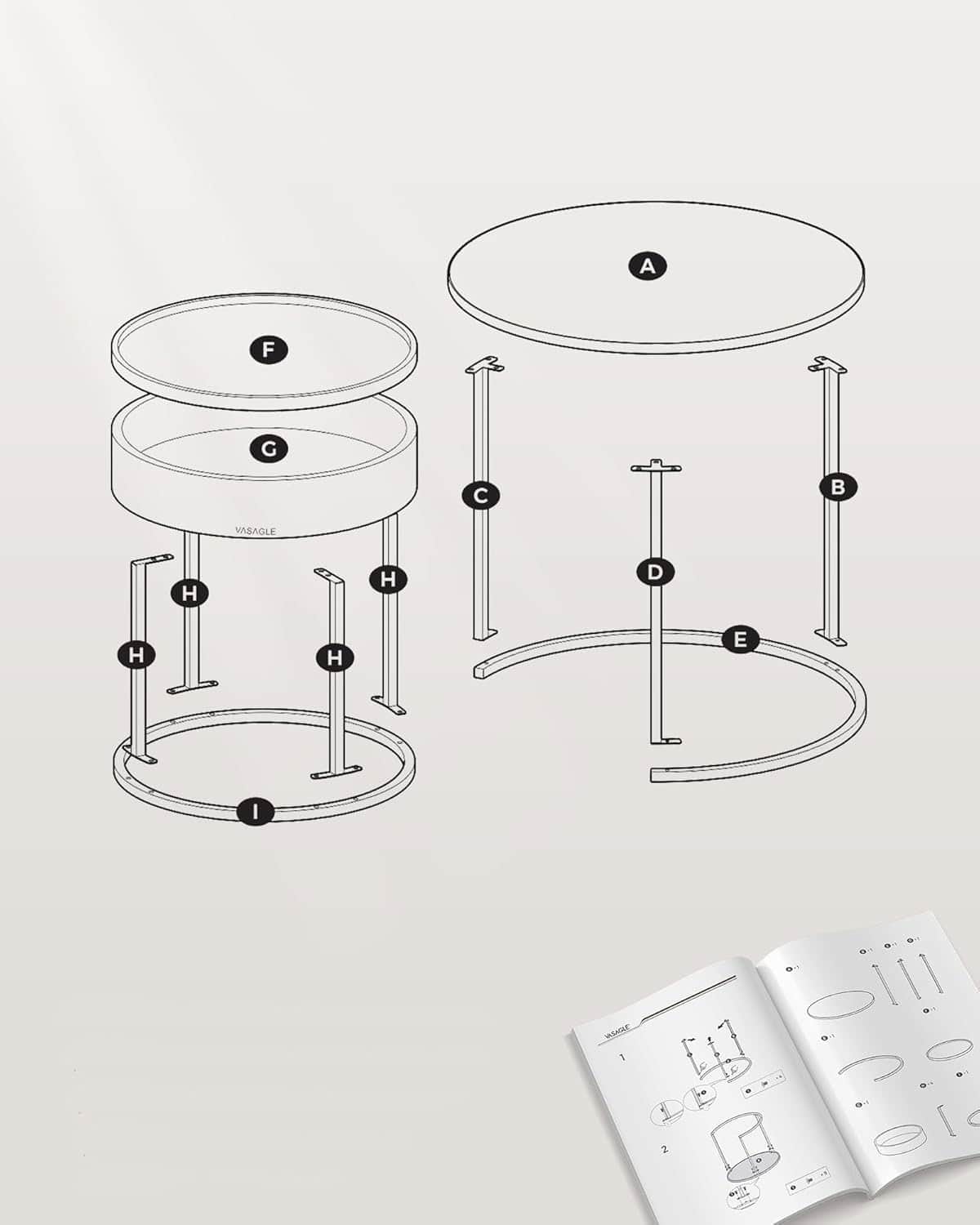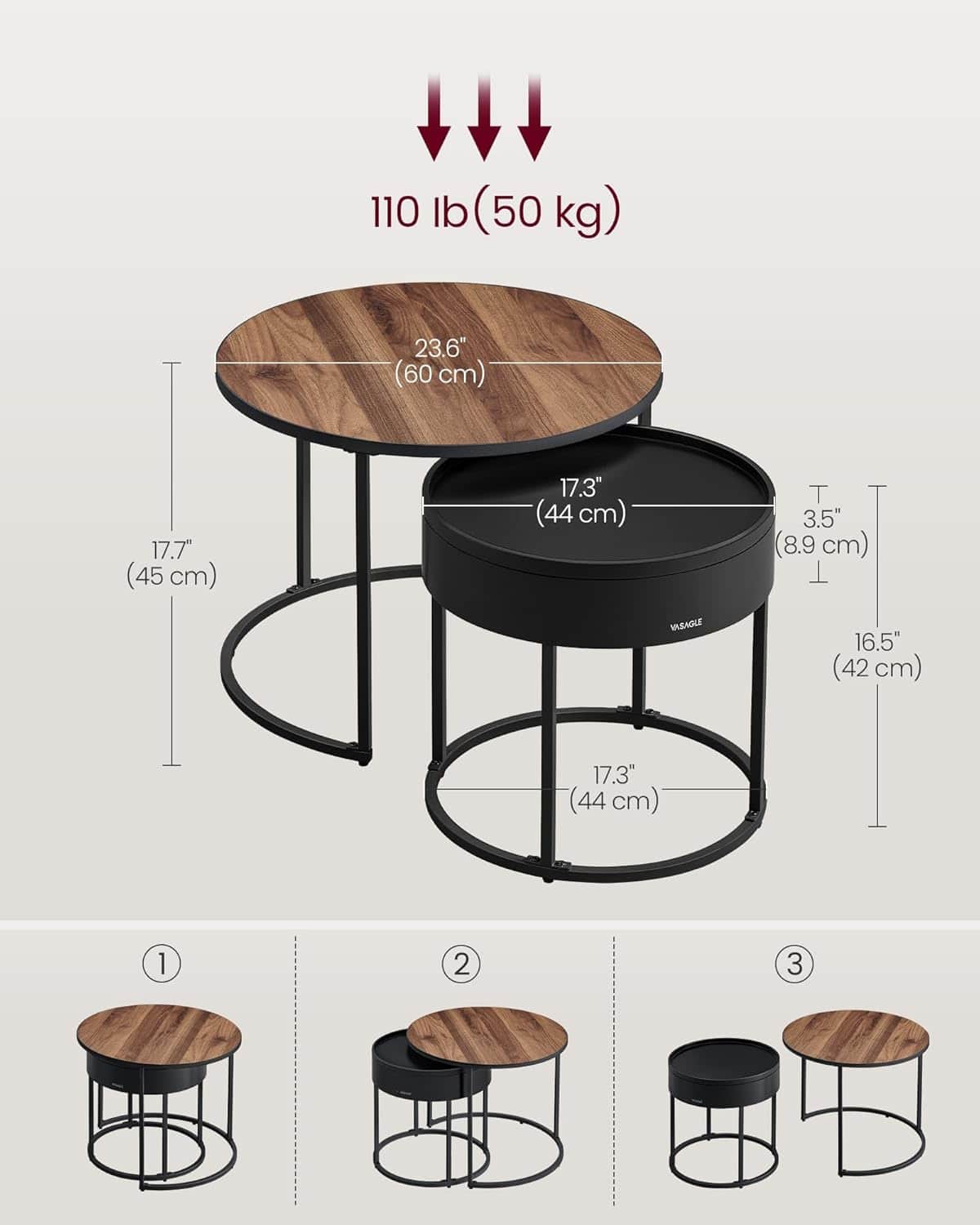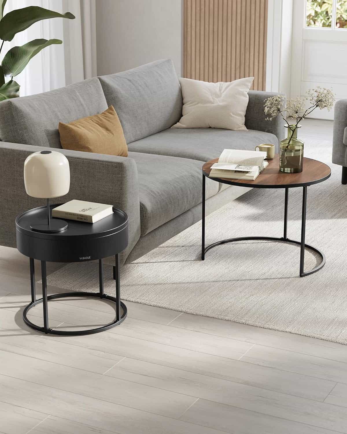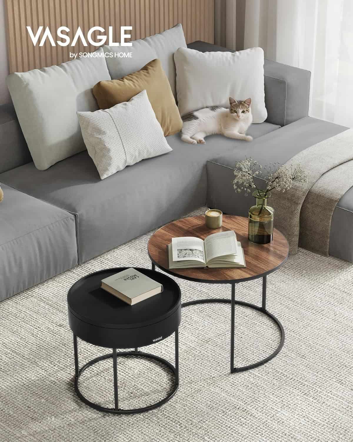 - Acest set de 2 masute rotunde VASAGLE imbina eleganta moderna cu functionalitatea. Designul nesting permite economisirea spatiului, iar compartimentul ascuns din masuta mica este perfect pentru depozitarea obiectelor marunte. Ideale pentru living, dormitor sau balcon. Caracteristici principale:
